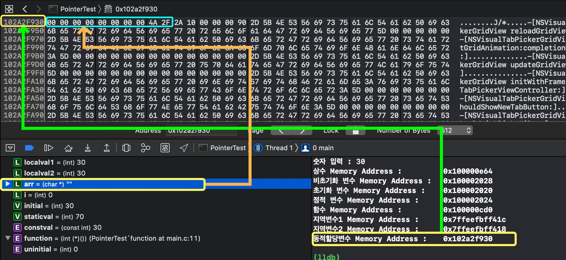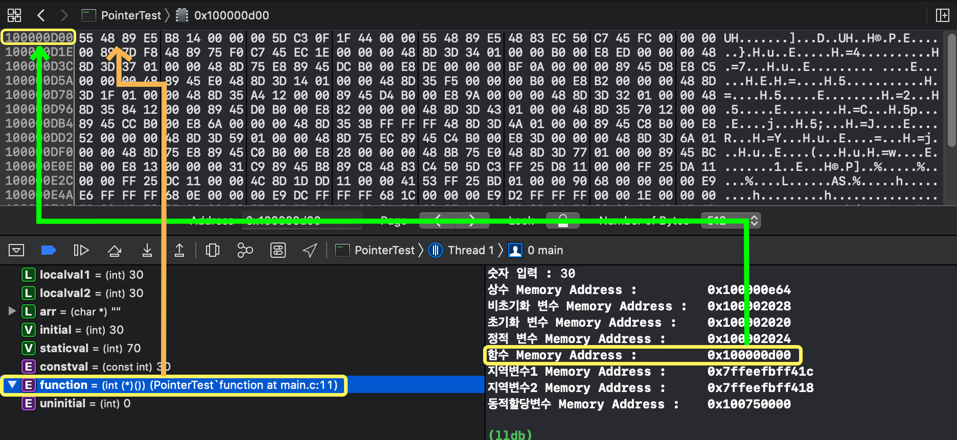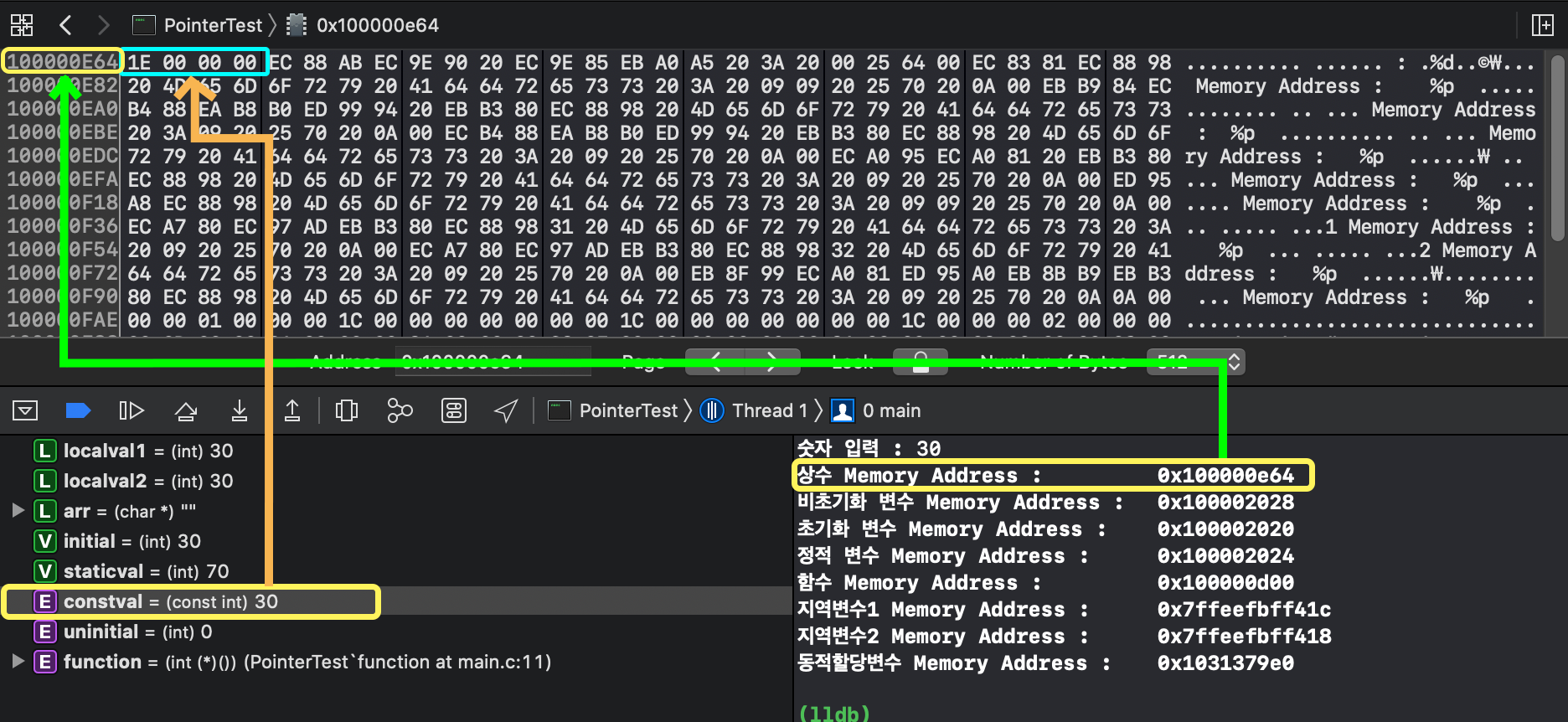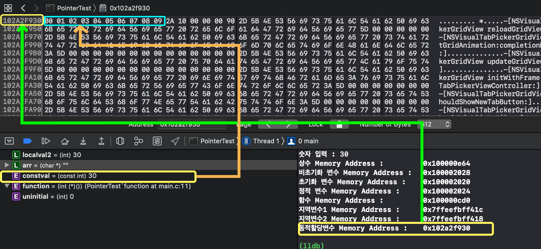 그리고 해당 메모리 주소를 출력하는 방법은 %p 을 쓰시면 됩니다.
