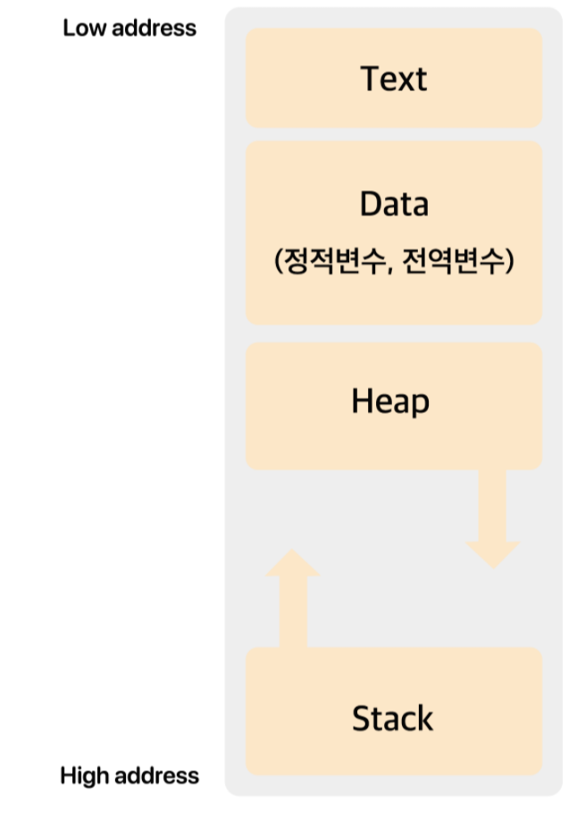 쉽게 생각하면 위 4개의 영역 중 Text영역이 가장 낮은 주소(0에 가까운 주소), Data영역이 그 다음 주소, Heap영역이 Data영역의 다음 주소, Stack영역은 4개 영역 중 가장 높은 주소에 위치한다고 보면 되죠.