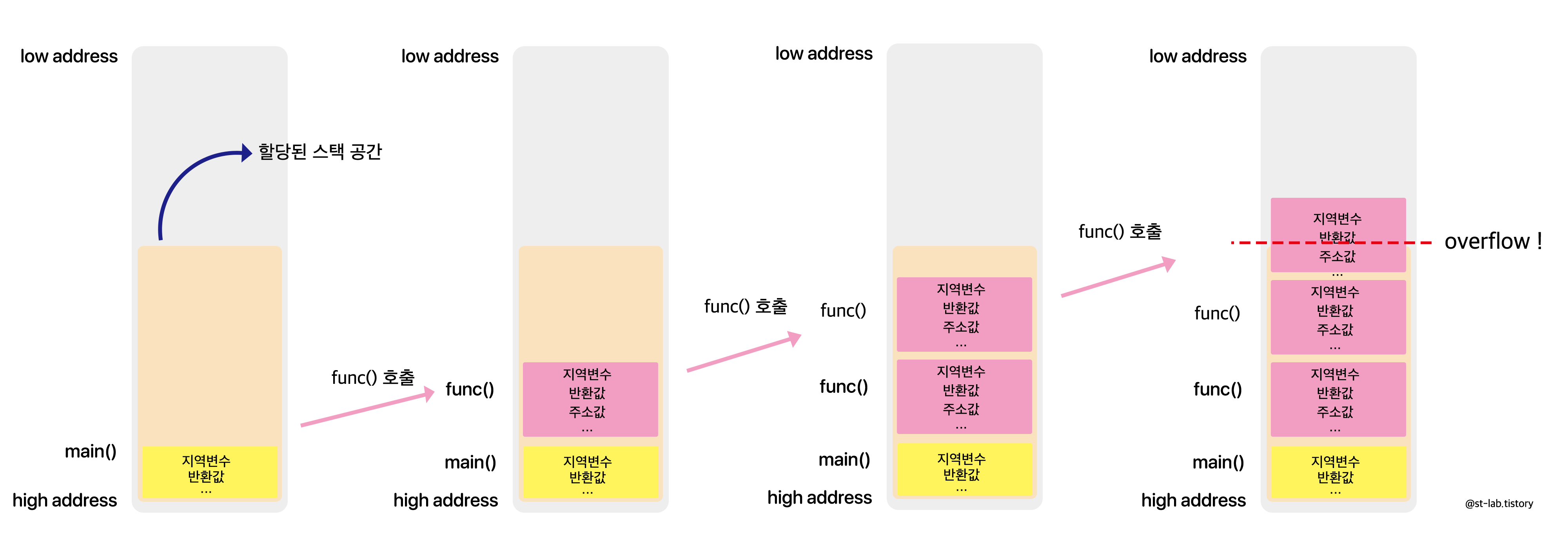 이렇게 어떤 할당된 공간을 넘어서게 되면 overflow 가 발생한다고하고, 그 에러가 Stack에서 발생한 경우 Stack Overflow라고 하는 것입니다.