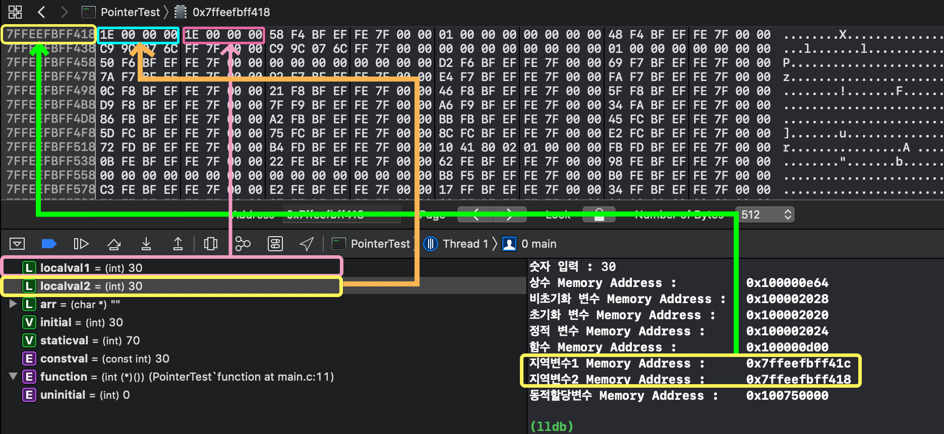 실재로 저 코드를 실행시키면 각 카운트마다 변수의 주소가 32씩 변하는 것을 볼 수 있습니다.