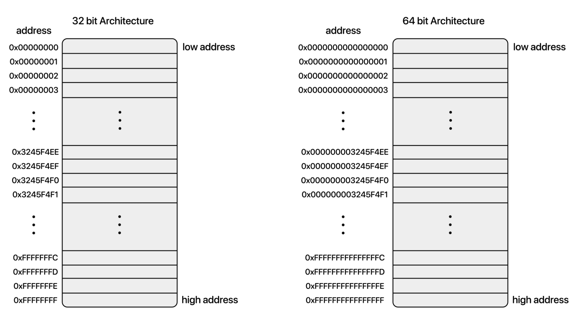 그리고 232까지의 경우의 수가 있으니, 4,294,967,296 개의 주소를 가리킬 수 있다는 의미이고, 이는 1바이트 크기의 메모리가 4,294,967,296 개 까지 인식이 가능하다는 것, 즉 메모리의 최대 크기는 4,294,967,296 byte = 4GB 이죠. 옛날 32bit 운영체제가 대다수인 시절 메모리를 4GB까지밖에 설치 할 수 없는 이유가 여기서 나오는 것이죠.