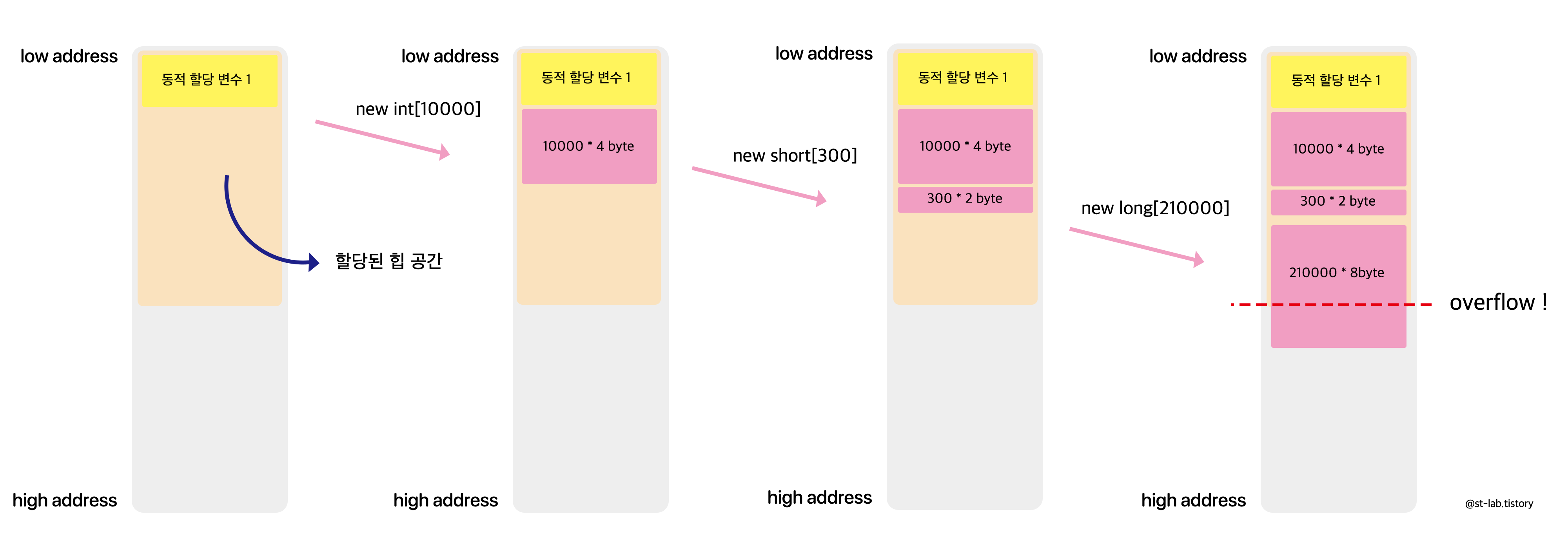 Heap 영역에서의 Overflow는 다음과 같이 볼 수 있겠네요.