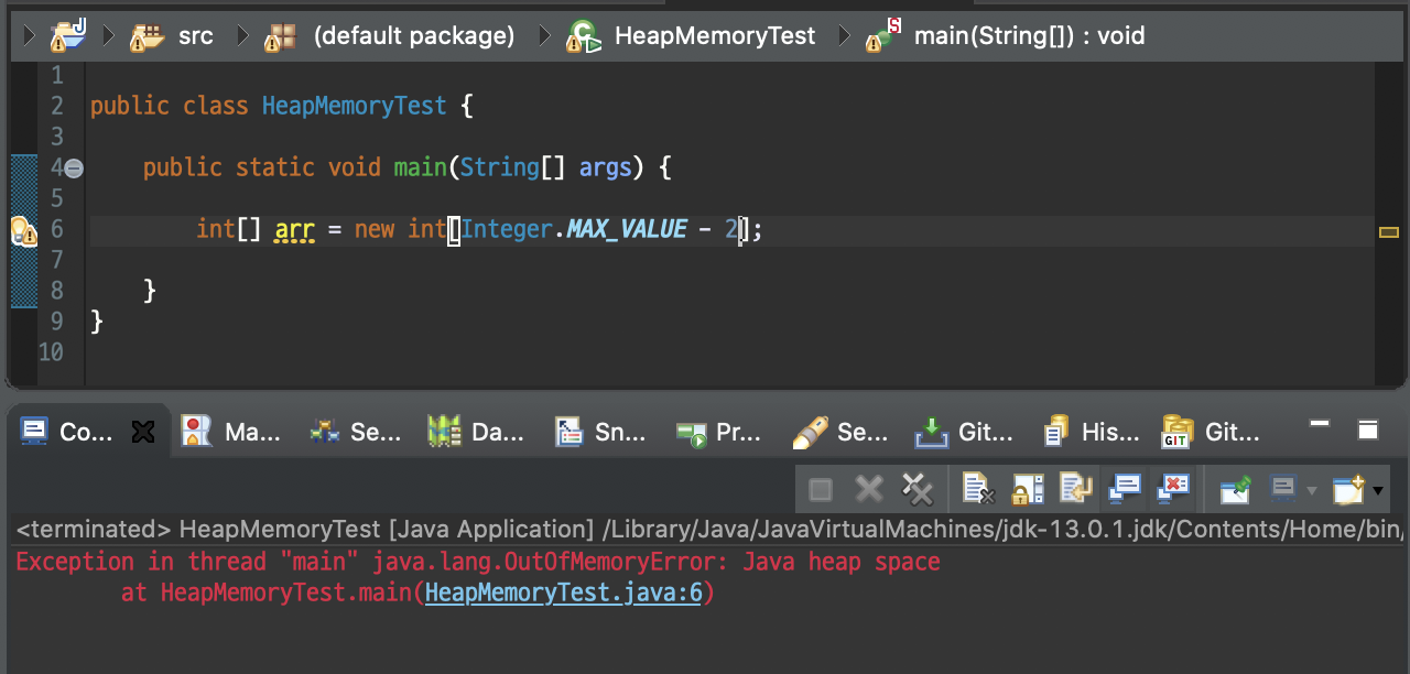 보면 아래 빨간색 글씨로 "Exception in thread "main" java.lang.OutOfMemoryError: Java heap space at HeapMemoryTest.main()" 이라고 뜨죠?
