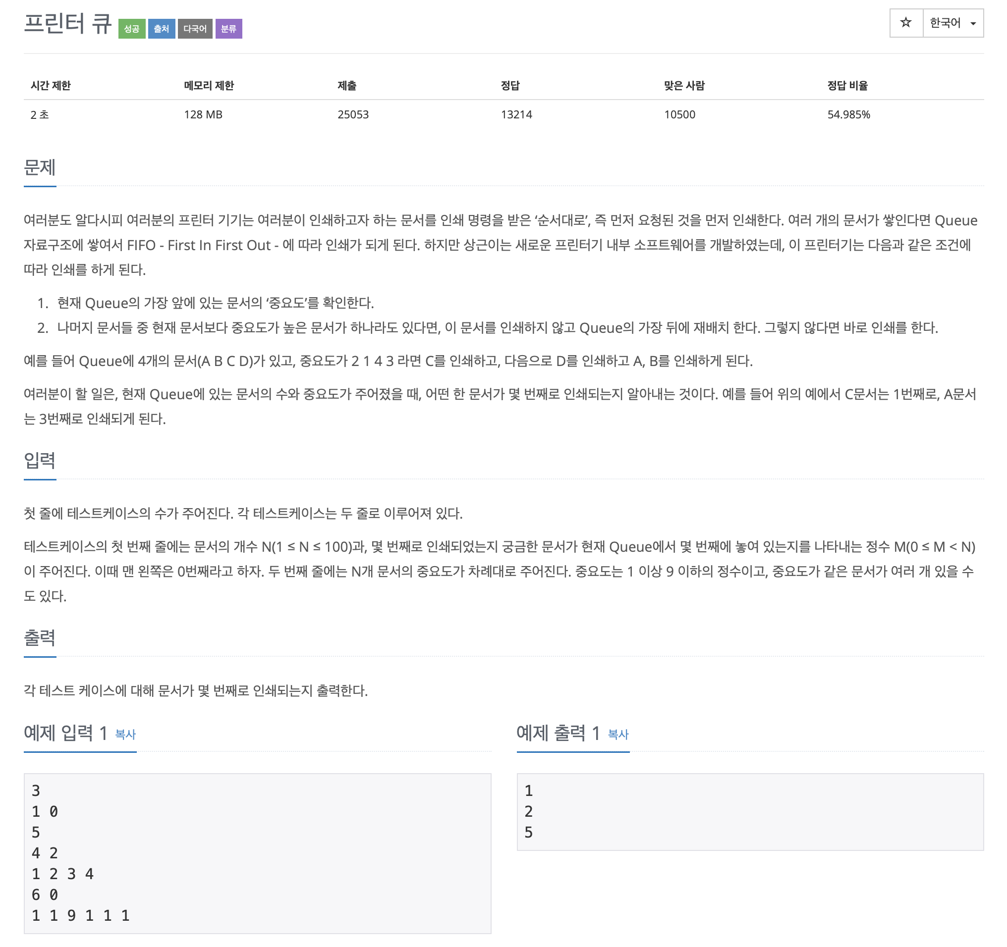 큐에 프린트 할 문서들이 배치되어있을 때, '중요도'가 높은 것 부터 뽑아야한다는 것이다.