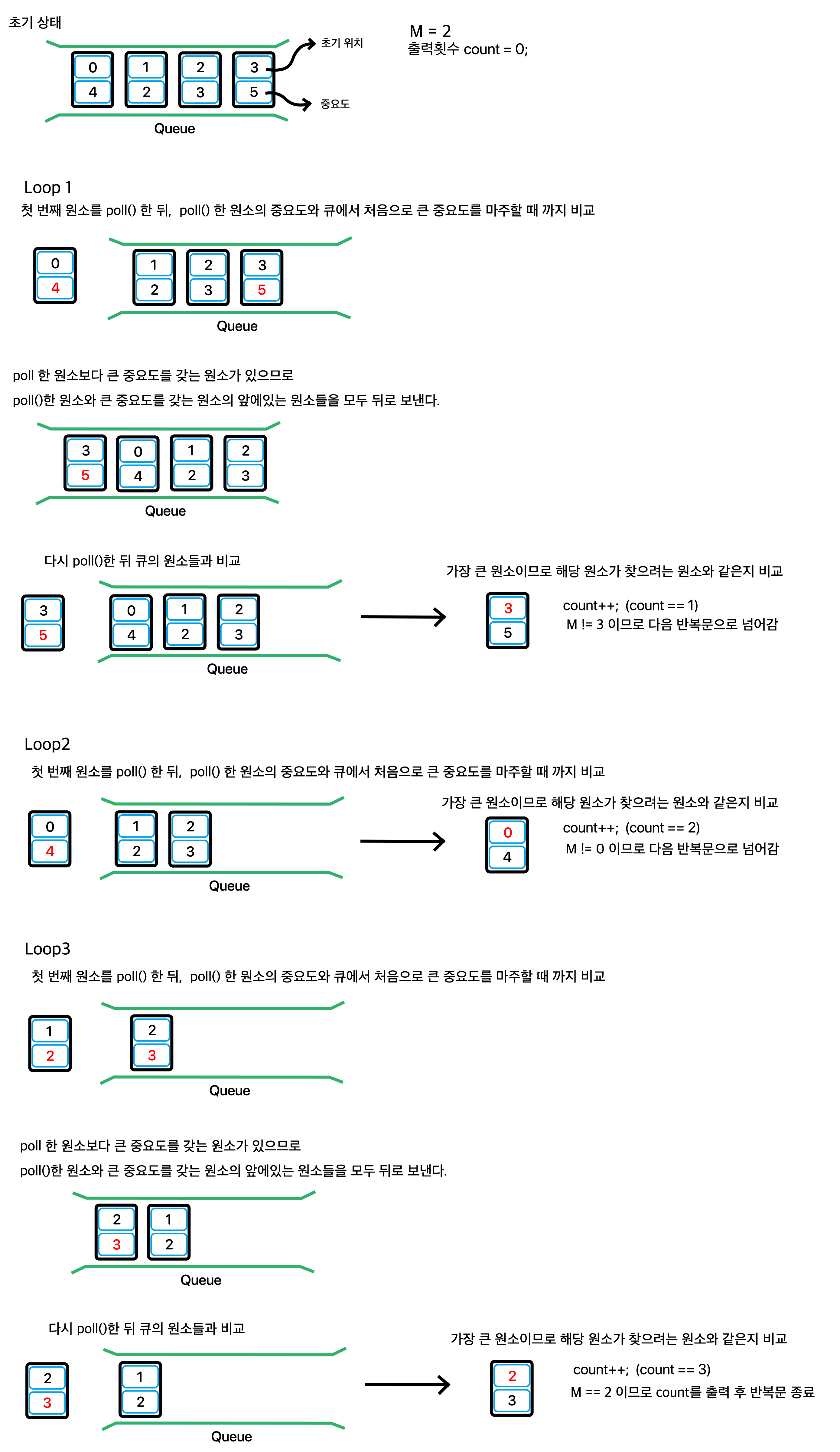 만약 큐에 poll() 된 원소보다 중요도가 큰 원소가 있는 경우에는 그 원소 앞에 있던 원소들을 뒤로 보낸 뒤, 다시 첫 원소를 poll()하여 비교를 큐 안에 poll() 된 원소보다 중요도가 큰 원소가 있는지를 검사해야 한다.