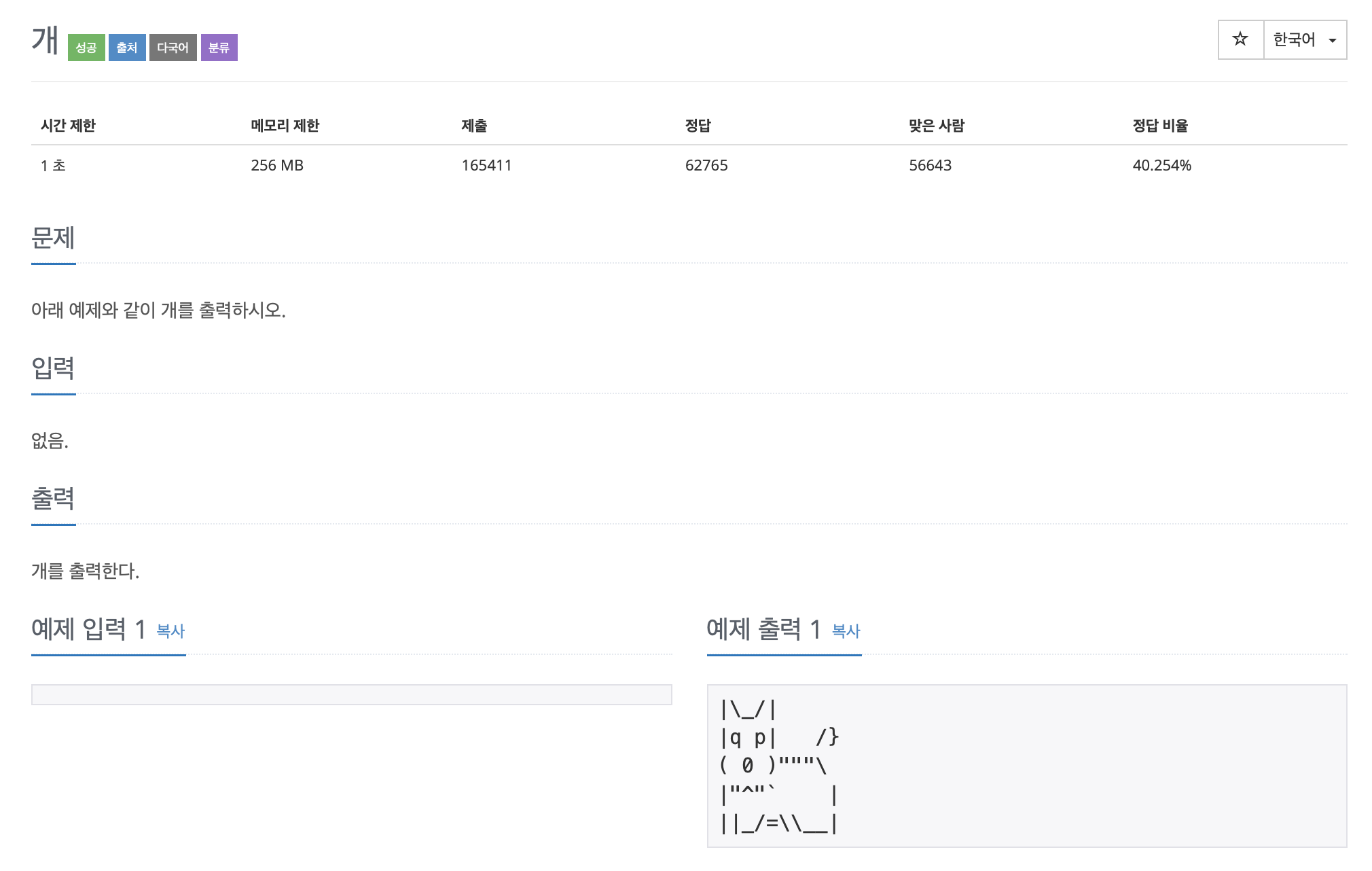 문제 아래 예제와 같이 개를 출력하시오. 입력 출력 예제 입력 1 복사 예제 출력 1 복사 |\_/| |q p| /} ( 0 )"""\ |"^"` | ||_/=\\__|...