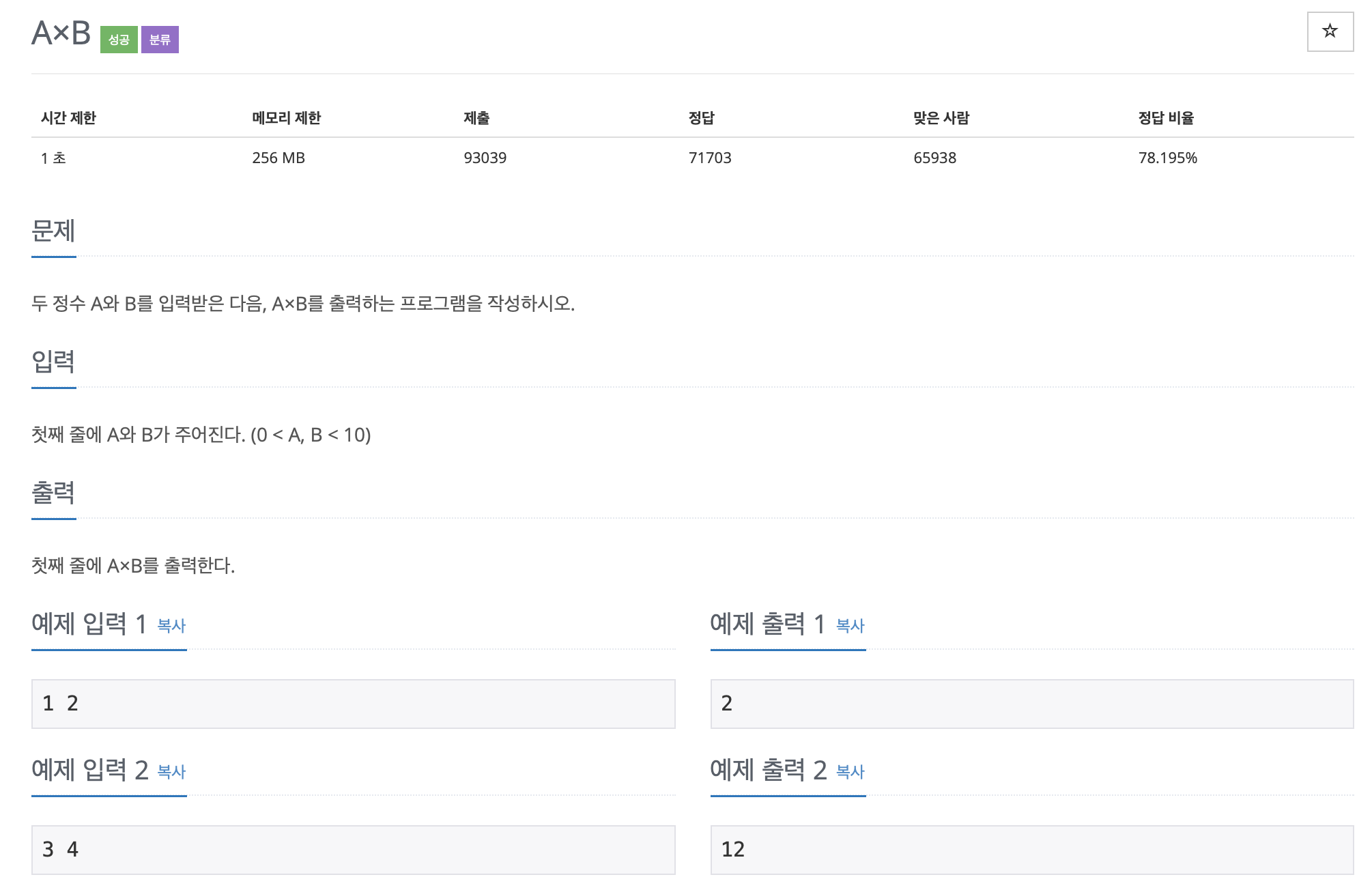 두 정수 A와 B를 입력받은 다음, A×B를 출력하는 프로그램을 작성하시오.