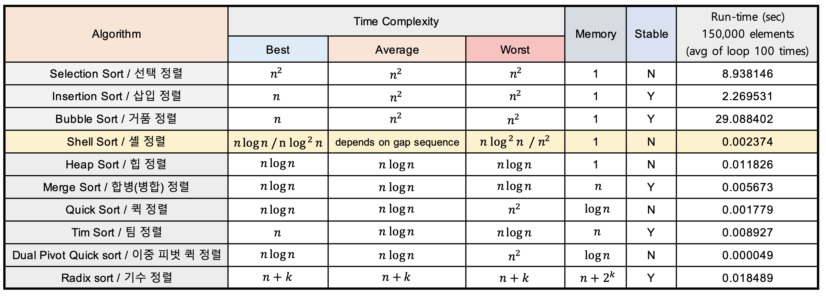 각 정렬 알고리즘 별 시간 복잡도와 평균 정렬 속도는 다음과 같다.