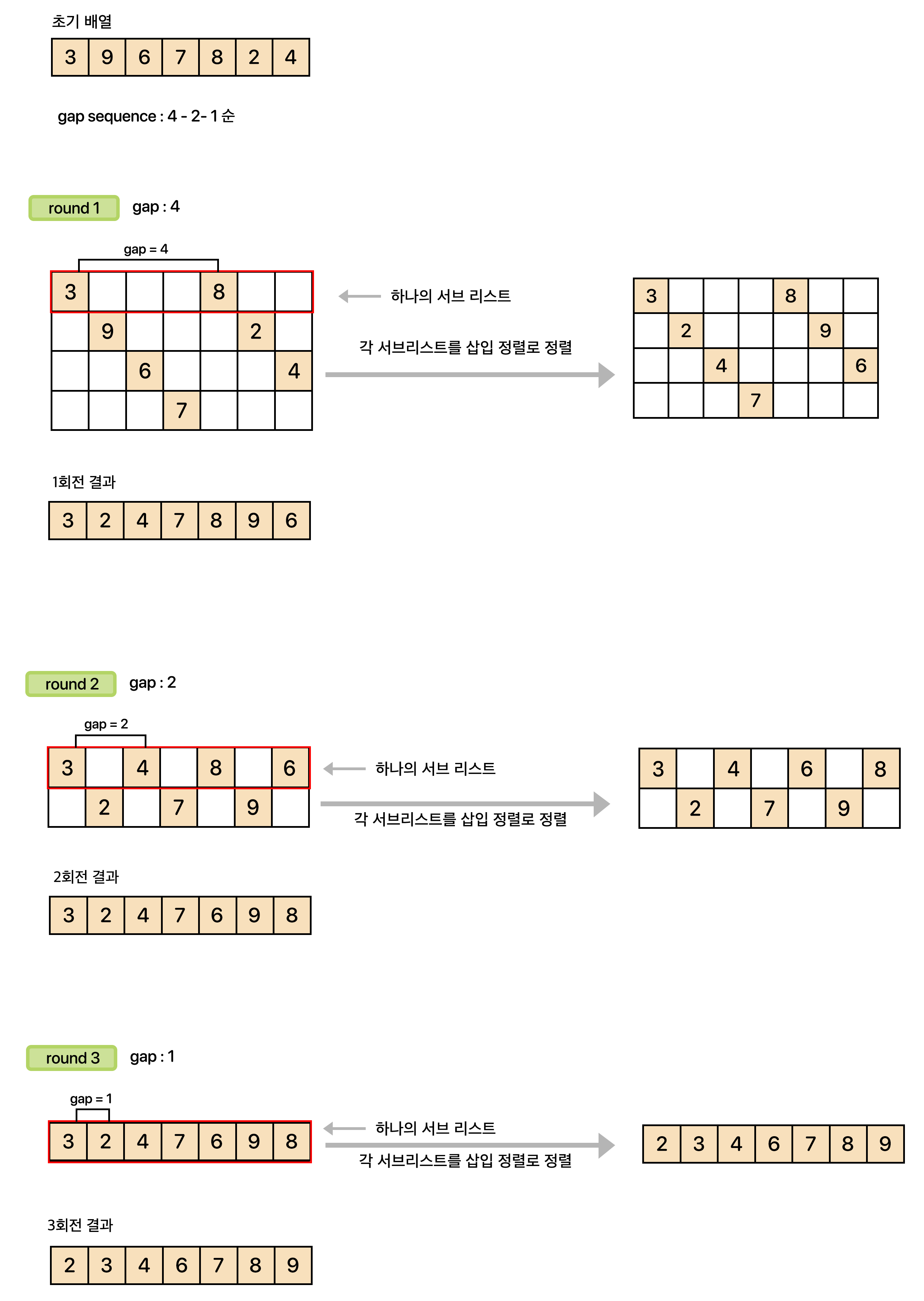 이렇게 일정 간격만큼 패스하면서 '거의 정렬 된 상태'로 만들고 최종적으로 마지막에 gap이 1인 삽입정렬을 시도하면 성능이 기존의 삽입 정렬보다 우수해지는 원리인 것이다.
