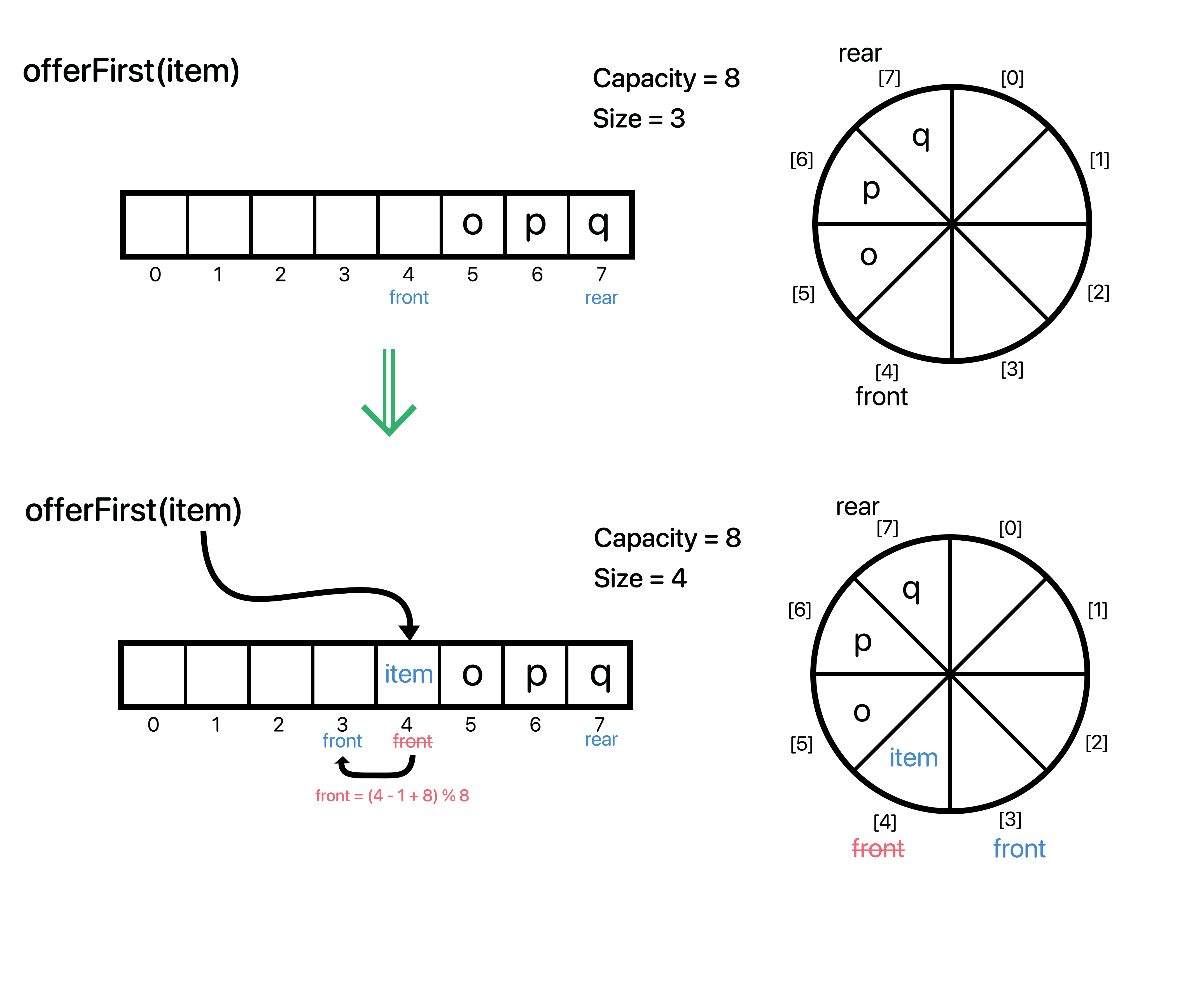 * deque[front] 에 원소를 넣은 뒤, front--; 을 해준다.