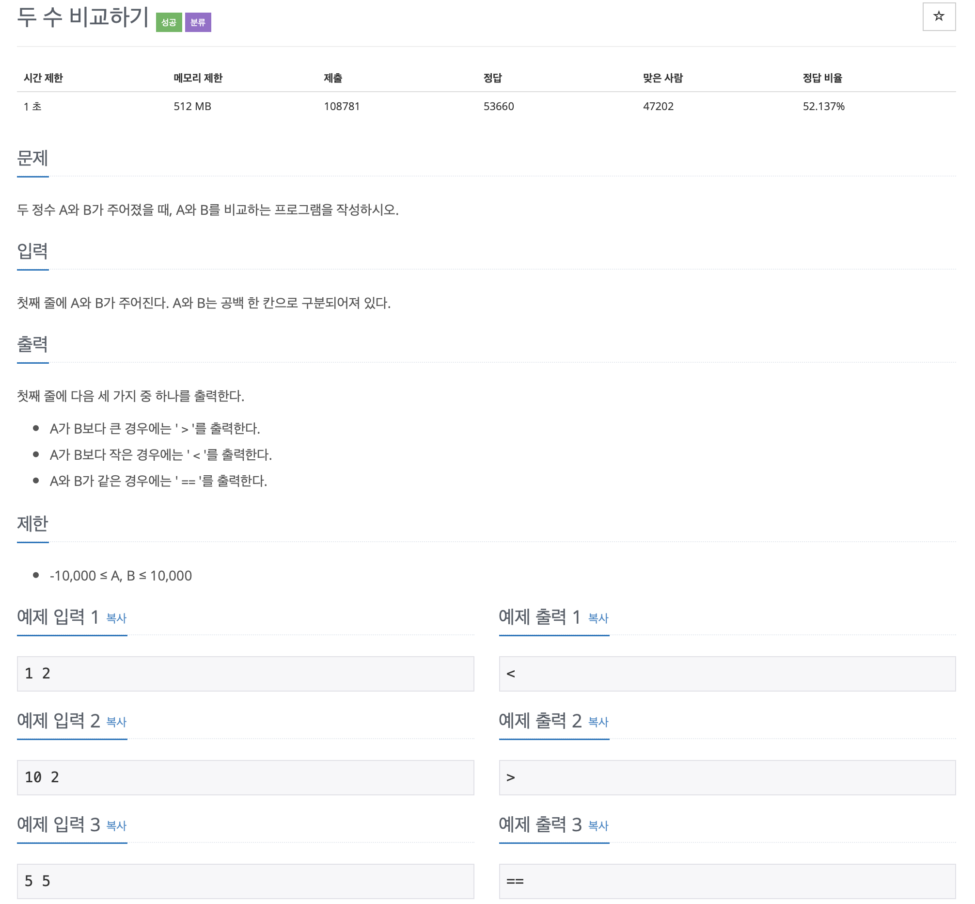 두 정수 A와 B가 주어졌을 때, A와 B를 비교하는 프로그램을 작성하시오.
