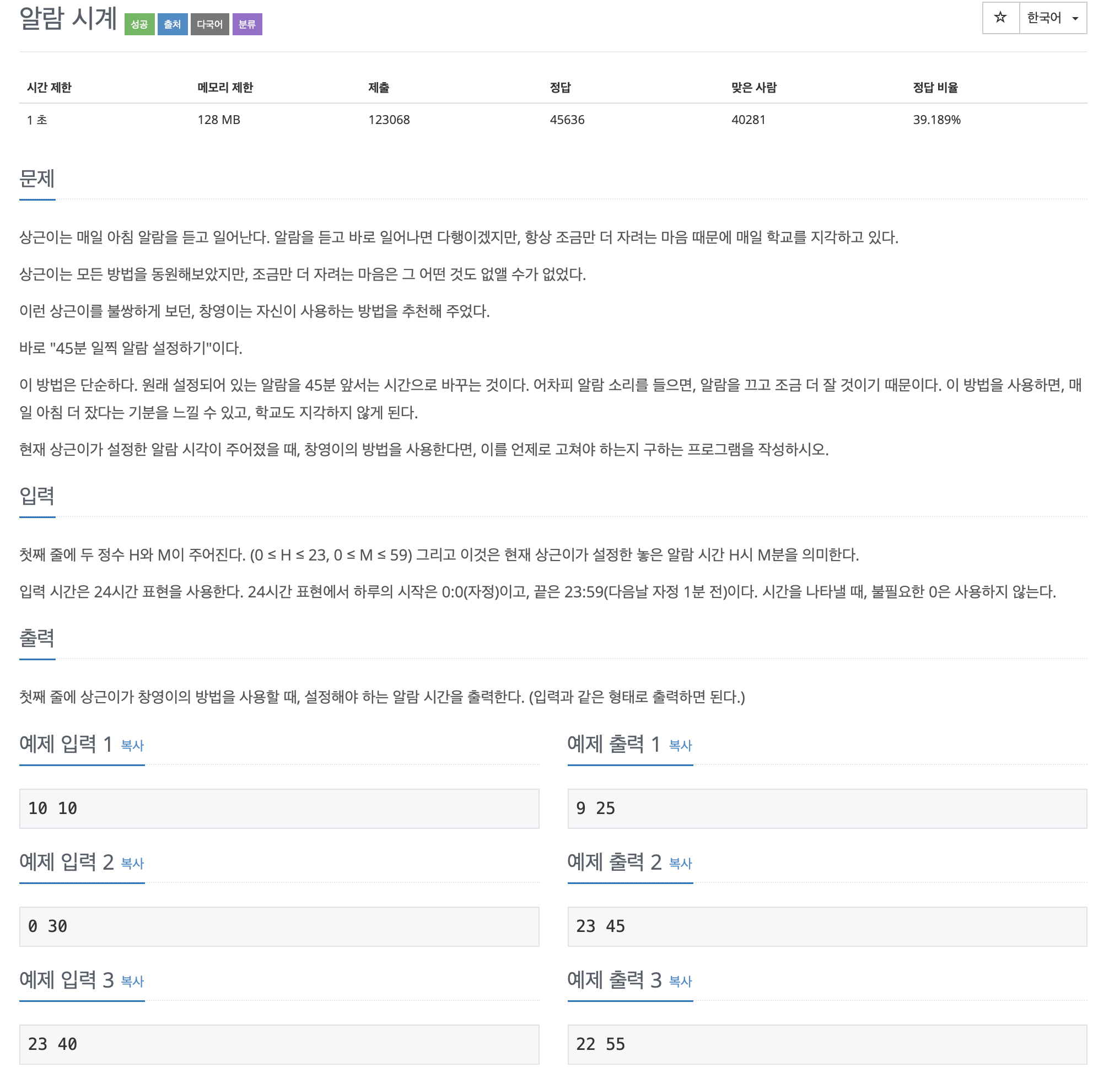 그 외의 경우에는 시간은 그대로, 분은 min-45를 출력해주면 된다.