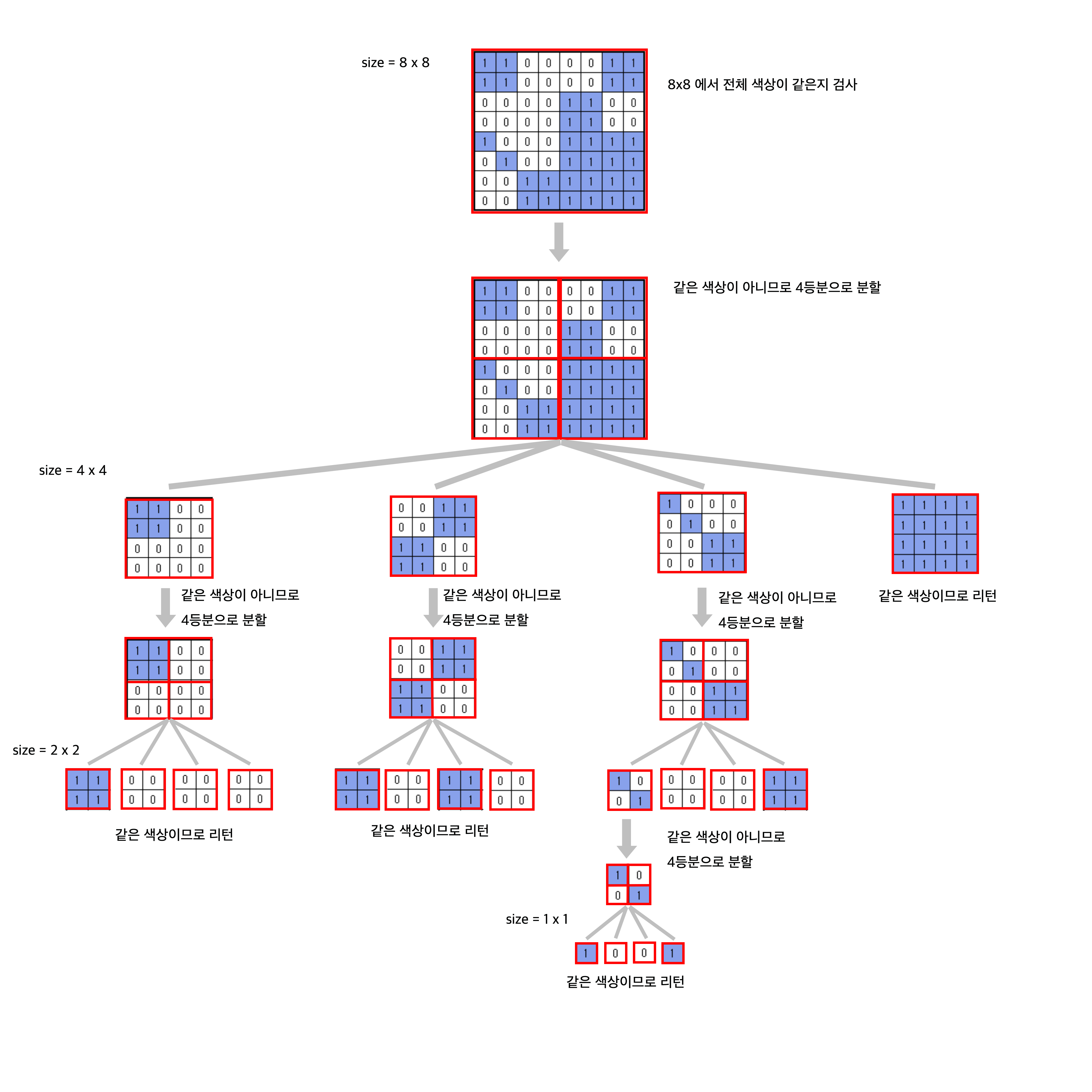 1. 각각의 행과 열의 시작점(초기는 (0, 0)이 기준)에서 현재 파티션에 대하여 모두 같은 색상인지 체크를 먼저 해야한다.