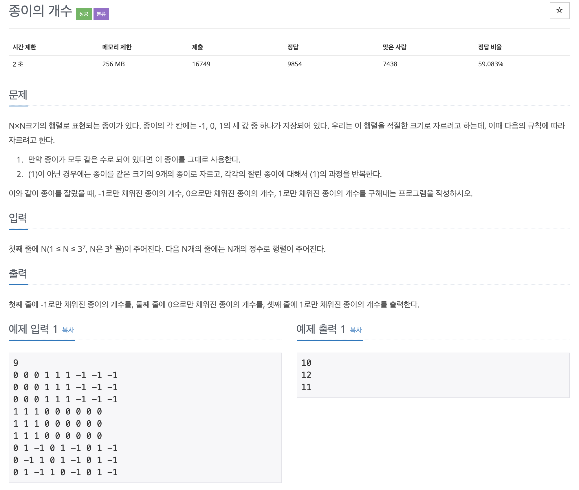 N×N크기의 행렬로 표현되는 종이가 있다. 종이의 각 칸에는 -1, 0, 1의 세 값 중 하나가 저장되어 있다. 우리는 이 행렬을 적절한 크기로 자르려고 하는데, 이때 다음의 규칙에 따라 자르려고 한다.