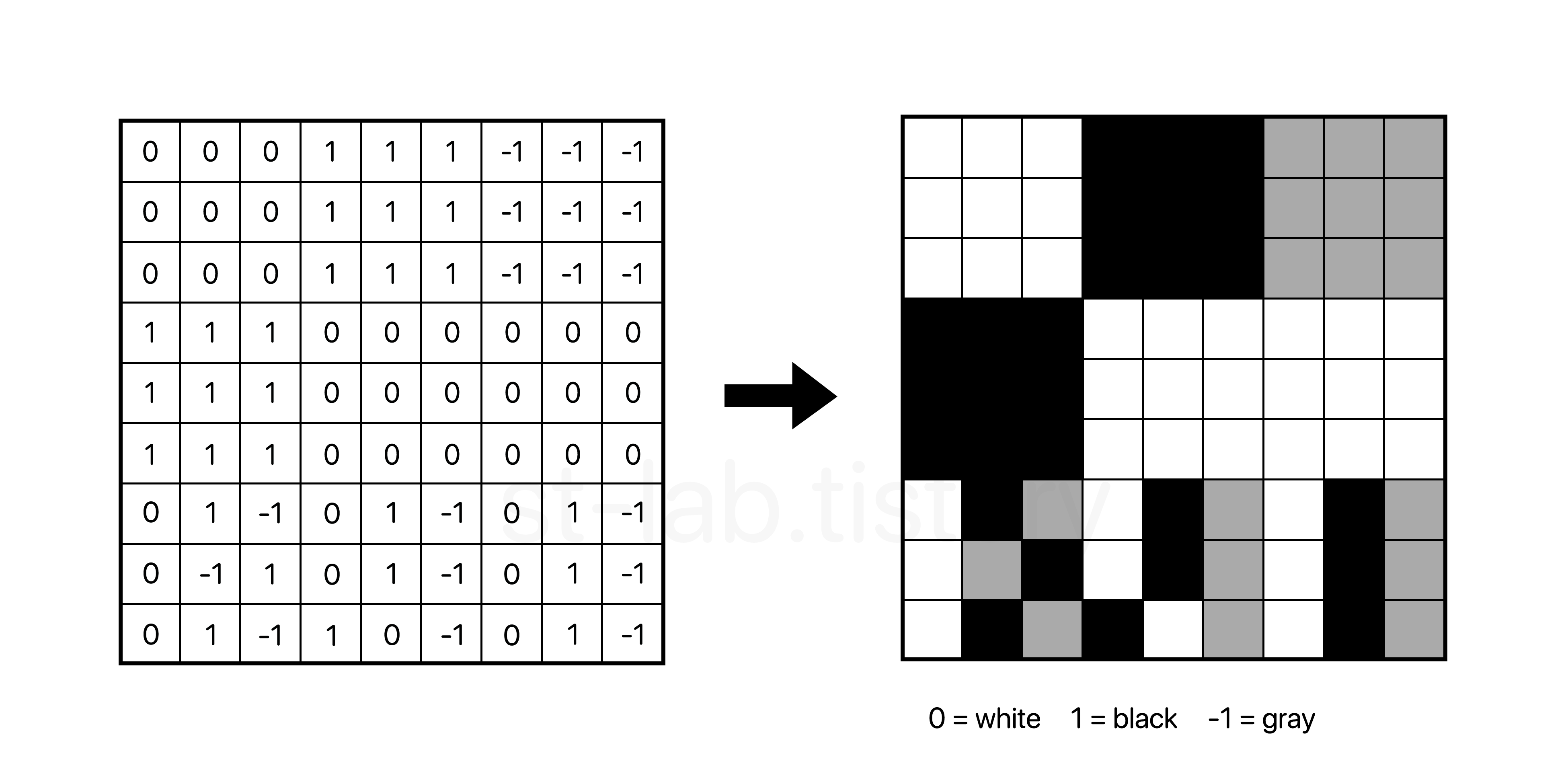 일단 문제를 보기 쉽게 이미지로 생각해보자. 위 문제에서의 예제를 토대로 0은 하얀색, 1은 검은색, -1은 회색으로 대체하여 표현해보았다.