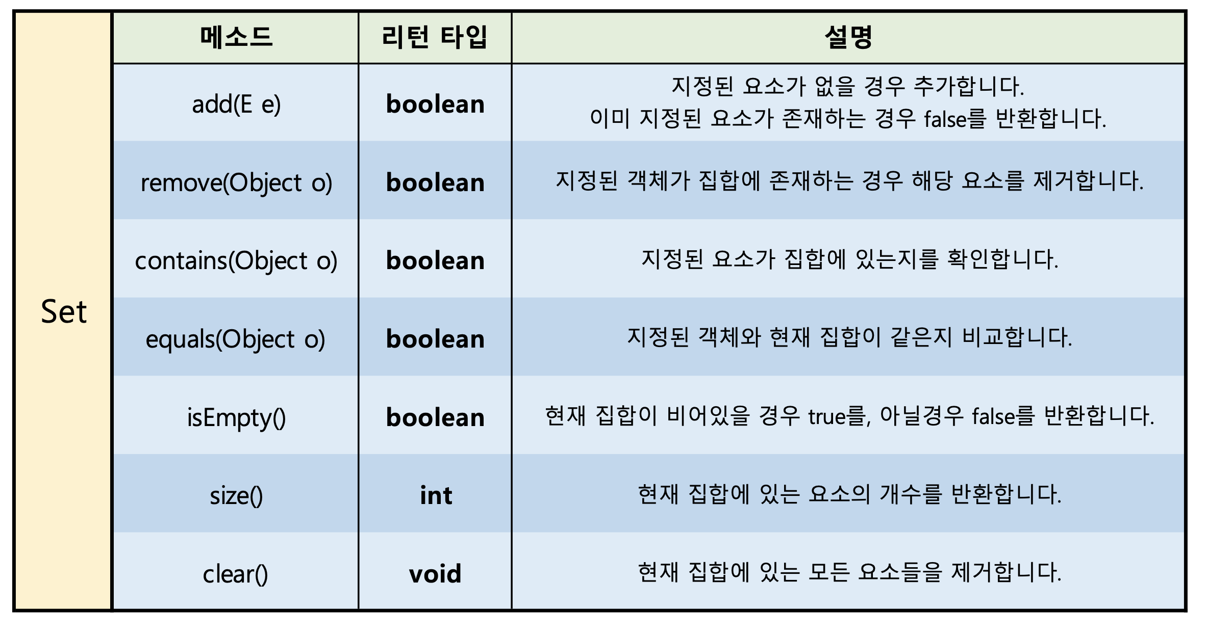 그럼 이제 Set 인터페이스에 선언 할 메소드들을 살펴보도록 하겠다.