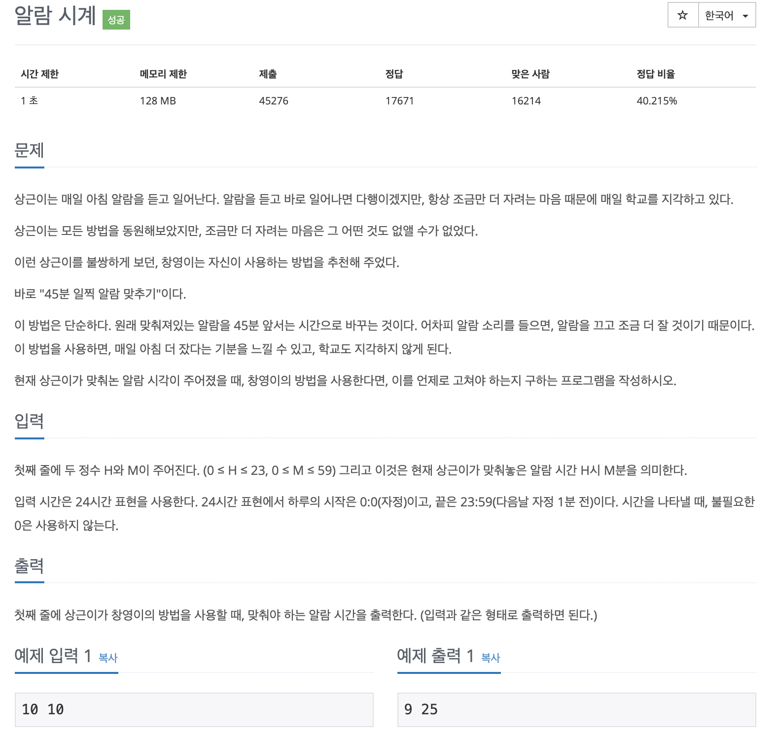 문제 상근이는 매일 아침 알람을 듣고 일어난다. 알람을 듣고 바로 일어나면 다행이겠지만, 항상 조금만 더 자려는 마음 때문에 매일 학교를 지각하고 있다. 상근이는 모든 방법을 동원해보았지만, 조금만 더 자려는 마음은 그 어떤 것도 없앨 수가 없었다. 이런 상근이를 불쌍하게 보던, 창영이는 자신이 사용하는 방법을 추천해 주었다. 바로 "45분 일찍 알람 맞추기"이다. 이 방법은 단순하다. 원래 맞춰져있는 알람을 45분 앞서는 시간으로 바꾸는 것이다. 어차피