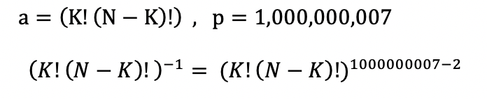 즉, (K! (N-K)!)1000000007-2 는 정수로 표현되기 때문에 이제 이를 곱셈 분배 법칙으로 변환하여 만들 수 있다.