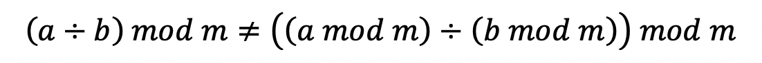 즉, 나눗셈(분수 꼴)의 수에 대한 모듈러 연산은 분배법칙을 적용 할 수가 없다는 뜻이다.