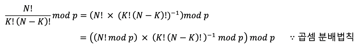 즉, (K! (N-K)!)1000000007-2 는 정수로 표현되기 때문에 이제 이를 곱셈 분배 법칙으로 변환하여 만들 수 있다.