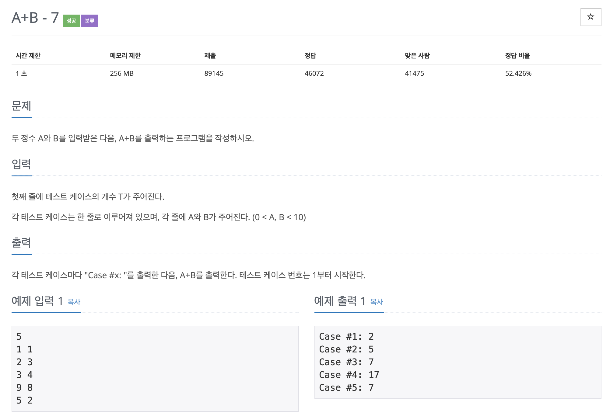 일단, 출력 형태를 보면 Case #N: sum(a+b) 형태다.