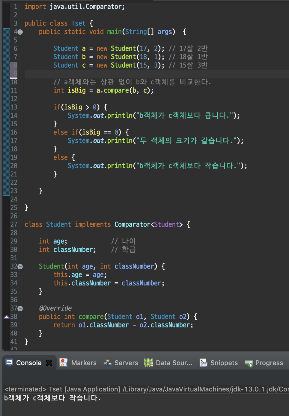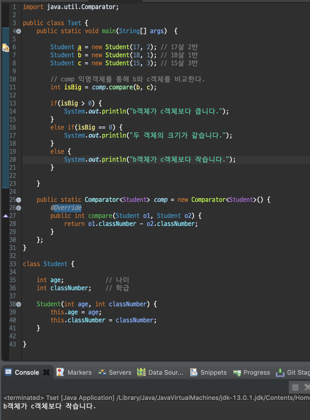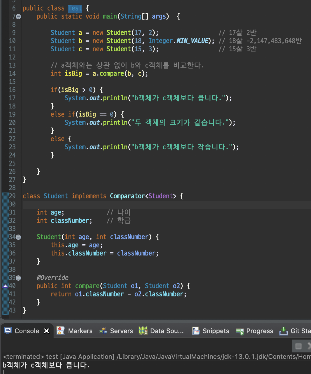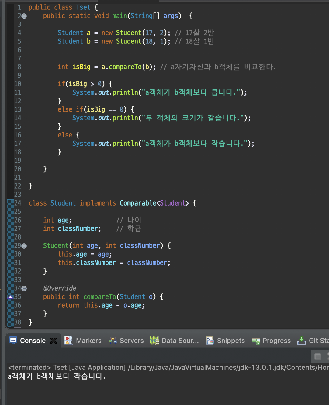 그럼 두 객체(a, b)를 어떻게 비교할 것인가? 부등호로 비교하려 하면, 나이(age)를 기준으로 비교되는 건가? 아니면 학급(classNumber)을 기준으로 비교되는 건가?