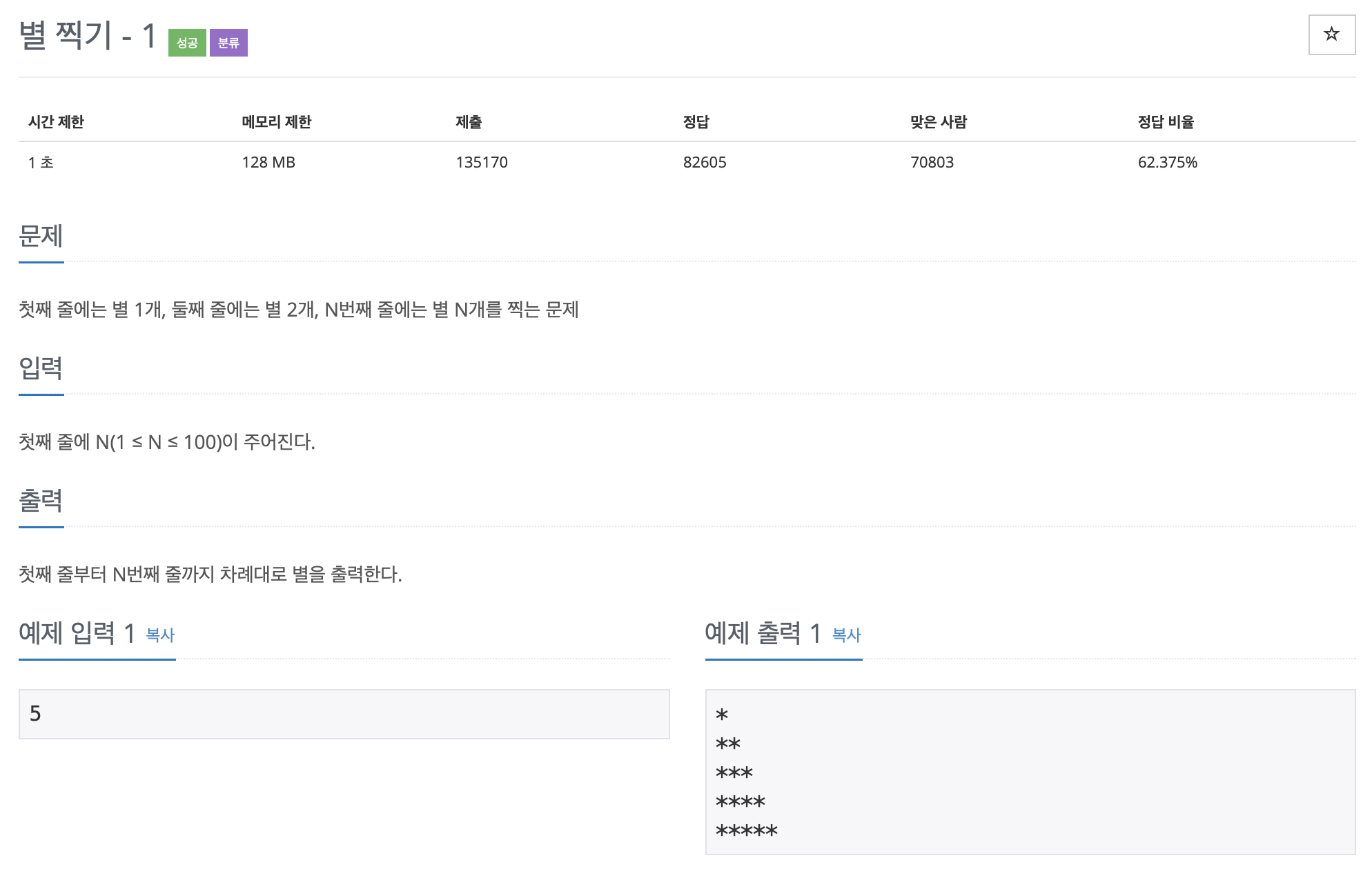 아마 많은 분들이 프로그래밍 언어에서 반복문을 접할 때 한 번쯤은 접하게 될 문제들일 것이다. 이 번 문제뿐만 아니라 다양한 형식으로 별을 찍는 문제들이 있으니, 만약 반복문 풀이에 자신이 있다면, 백준 문제에 올라와있는 다양한 별 찍기 문제들을 풀어보는 것도 좋을 것 같다.