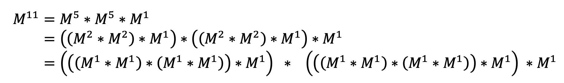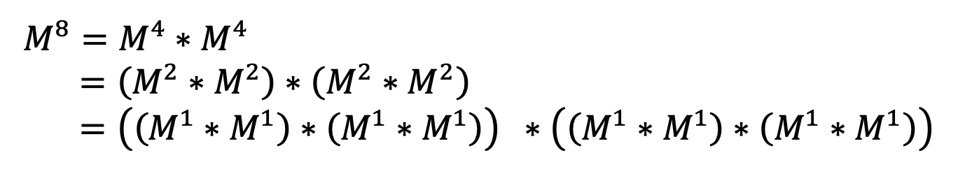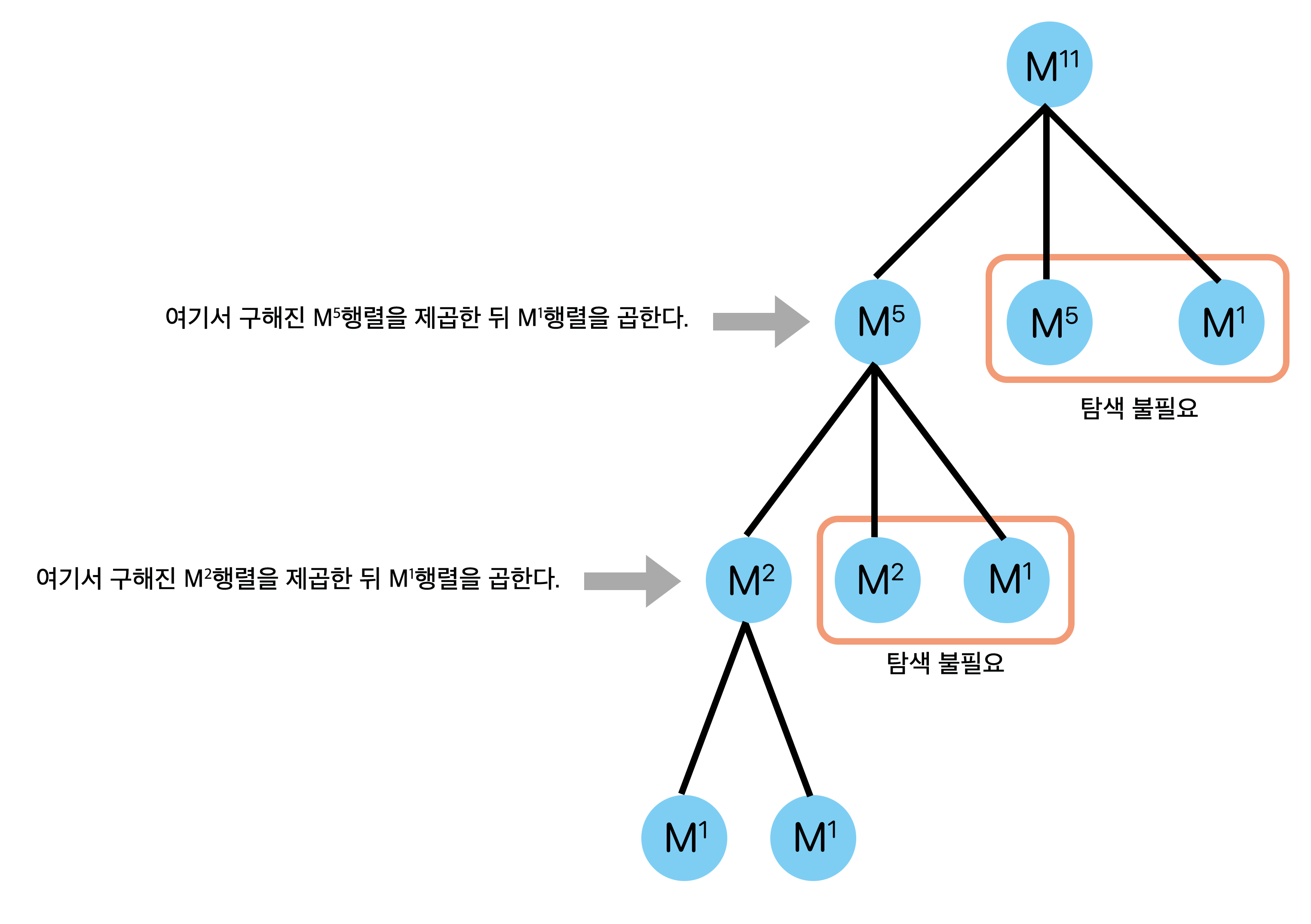 위 곱셈문제 풀이와 같게 행렬의 지수(exponential)를 절반으로 잘라가면서 분할정복을 해주면 된다.