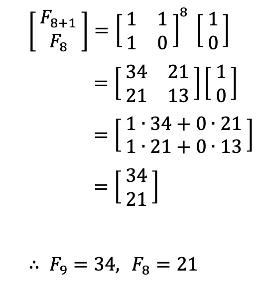 우리는 n제곱 할 행렬 A를 얻었다. 여러분들이 만약 몇 가지 케이스들을 대입해보면서 보면 느낄수도 있지만, A12 원소와 A21 원소는 항상 같다는 것을 느낄 수 있다. 그리고 위 n=8 에서 과정을 보면 1 * 34 + 0 * 21 으로 결과적으로 A11 원소가 Fn 원소값이 된다는 것을 확인 할 수 있다.