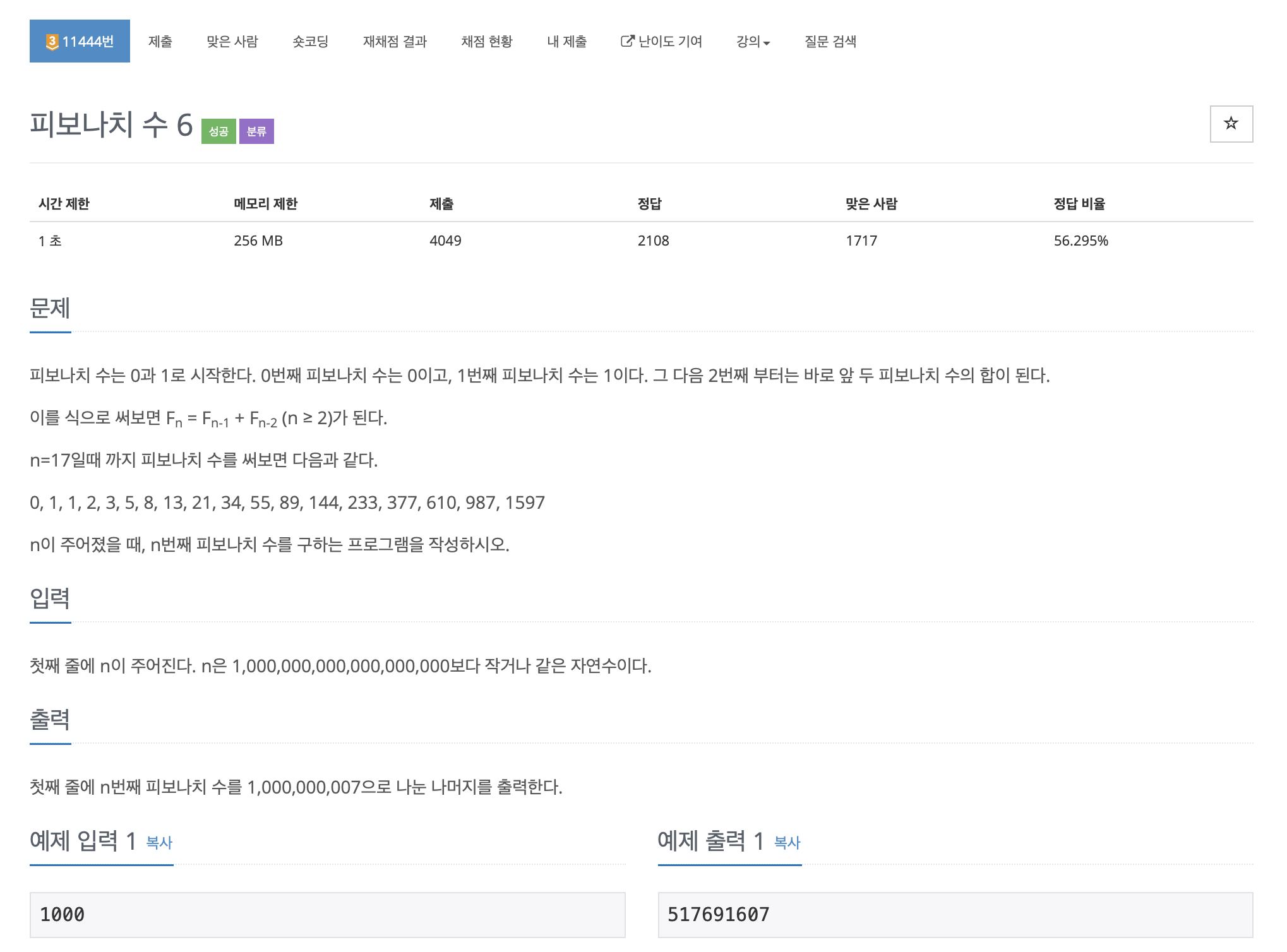 [백준] 11444번 : 피보나치 수 6 - JAVA [자바]