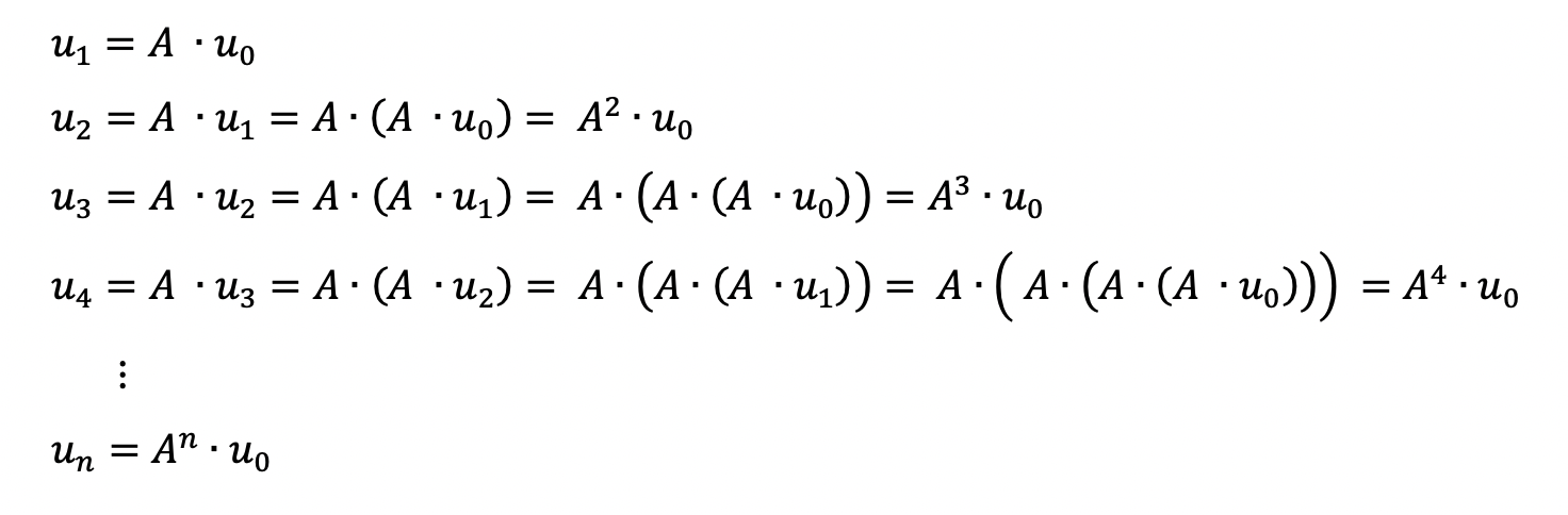 결과적으로 우리는 un = An*u0 으로 A라는 행렬의 n제곱으로 쉽게 구할 수 있다는 것이다. 이를 행렬로 표현하면 다음과 같다.