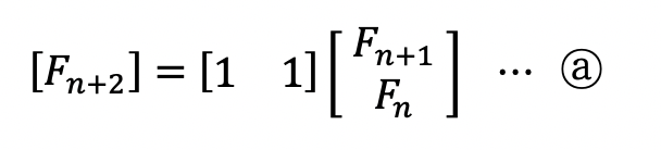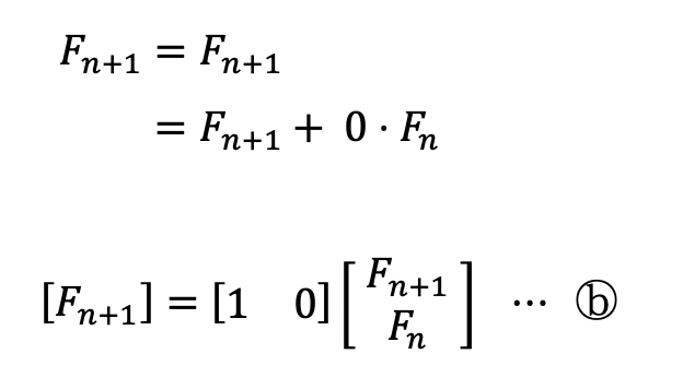 하지만, 이 것만으로는 행렬 연산을 통해 의미를 얻을 수 있는 수식은 아니다. F라는 방정식에 대해 n번째 값을 구하기 위해 Ax=b 꼴로 만들거라고 했다. 그러기 위해 x인 [Fn+1 Fn]T 를 공통으로 둘 수 있는 하나의 간단한 식을 추가하겠다. (T는 행렬의 전치라는 뜻이다. 글로는 세로로 수식을 작성하기 어려워 위와 같이 표현했다. 즉, 1×2 행렬인 식을 위 ⓐ식에서의 가장 마지막에 있는 세로로 된 2×1 행렬을 의미한다.)