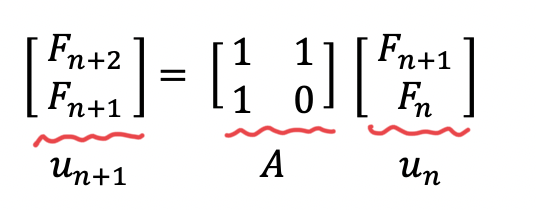 자 그럼 위 식을 한 번 일반화를 해보자. 우리는 Fn+1 과 Fn을 하나의 열벡터로 볼 수 있다. 이를 un이라고 한다면 Fn+2 와 Fn+1 은 un+1 으로 볼 수 있다. 즉 다음과 같이 표현 할 수 있다.