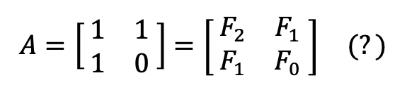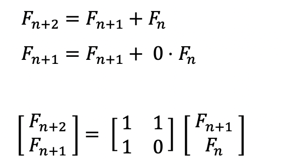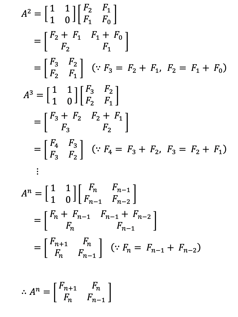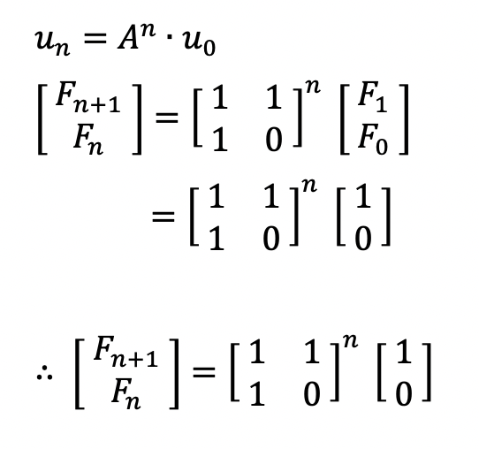 즉, 우리는 행렬 A인 ([1, 1], [1, 0]) 만 갖고도 행렬의 n제곱을 통해 피보나치 수를 얻을 수 있다는 것을 알 수 있다.