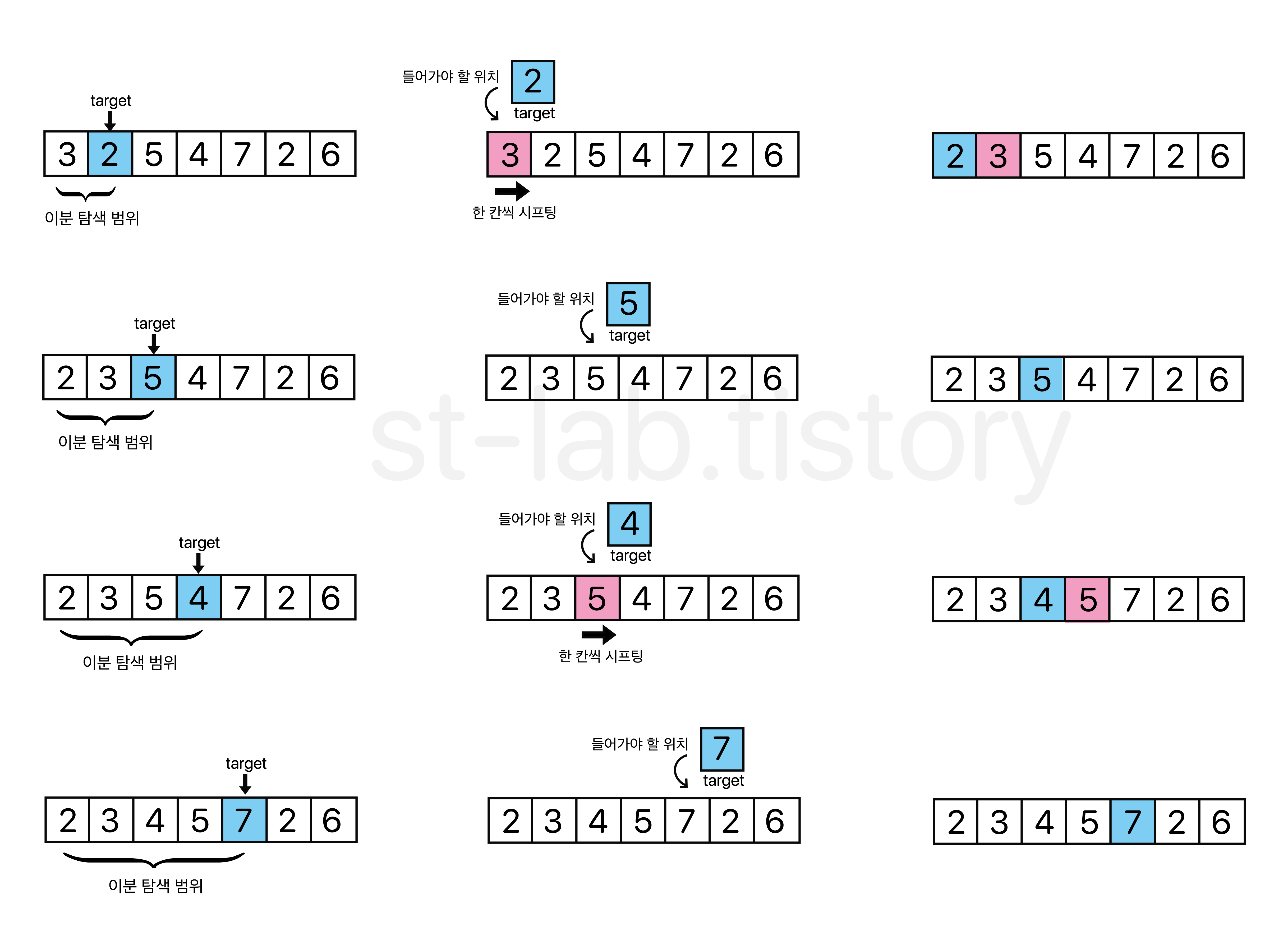 이진 삽입 정렬의 전체적인 과정은 이렇다. (오름차순을 기준으로 설명)