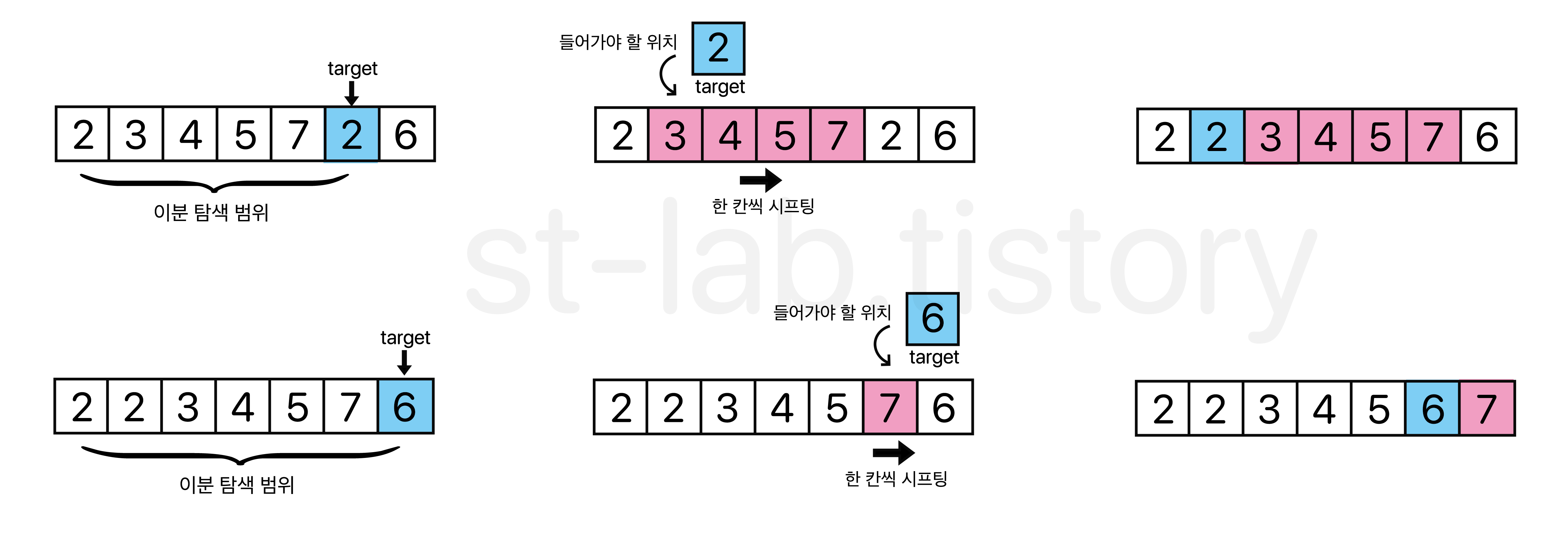 정렬 해야 할 target 원소에 대해 target 원소의 인덱스를 기점으로 타겟이 이전 원소보다 크기 전 까지 반복하면서 반복을 멈춘 위치가 target 원소가 들어갈 위치가 되는 것이다.