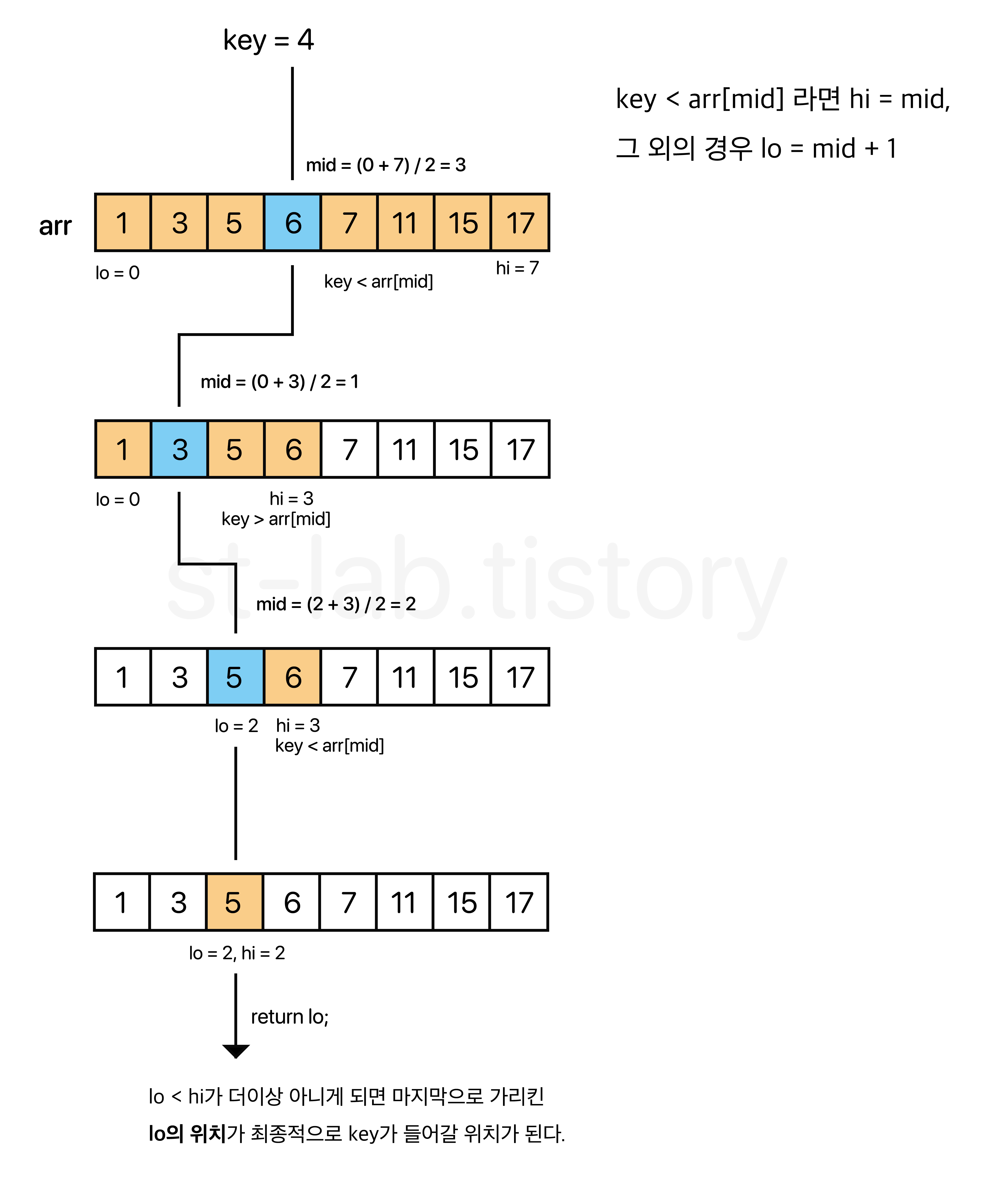 설명은 이해를 돕기 위해 (lo + hi) / 2로 일단 진행을 하고, 코드 작성 부분에서만 lo + ((hi - lo) / 2) 로 작성하도록 하겠다.