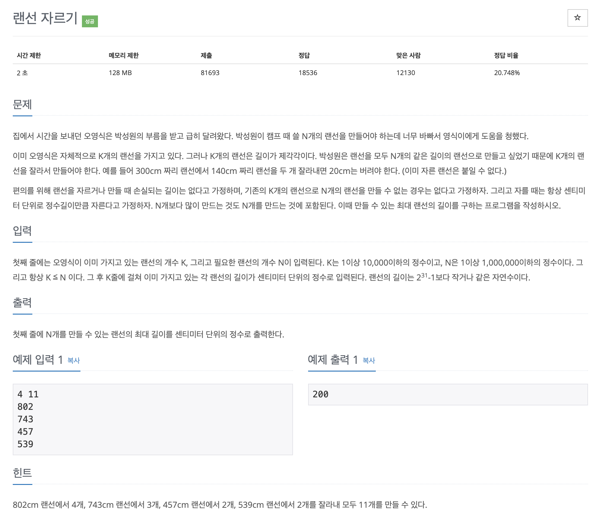 총 11개의 랜선을 갖게 되지만, 198 길이가 최댓값은 아니다.