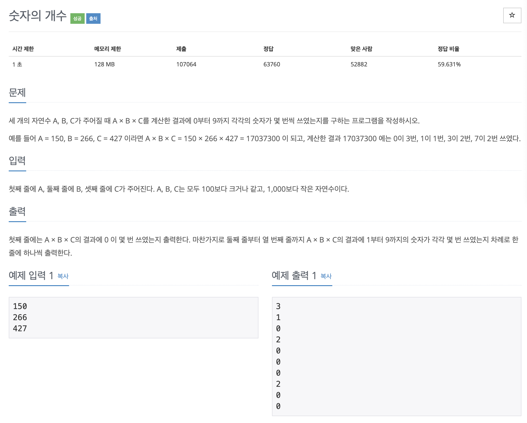 3개의 수를 곱한 수에 대해 각 자릿수들이 0~9까지 각각 몇 번 나왔는지를 출력하면 되는 문제다.