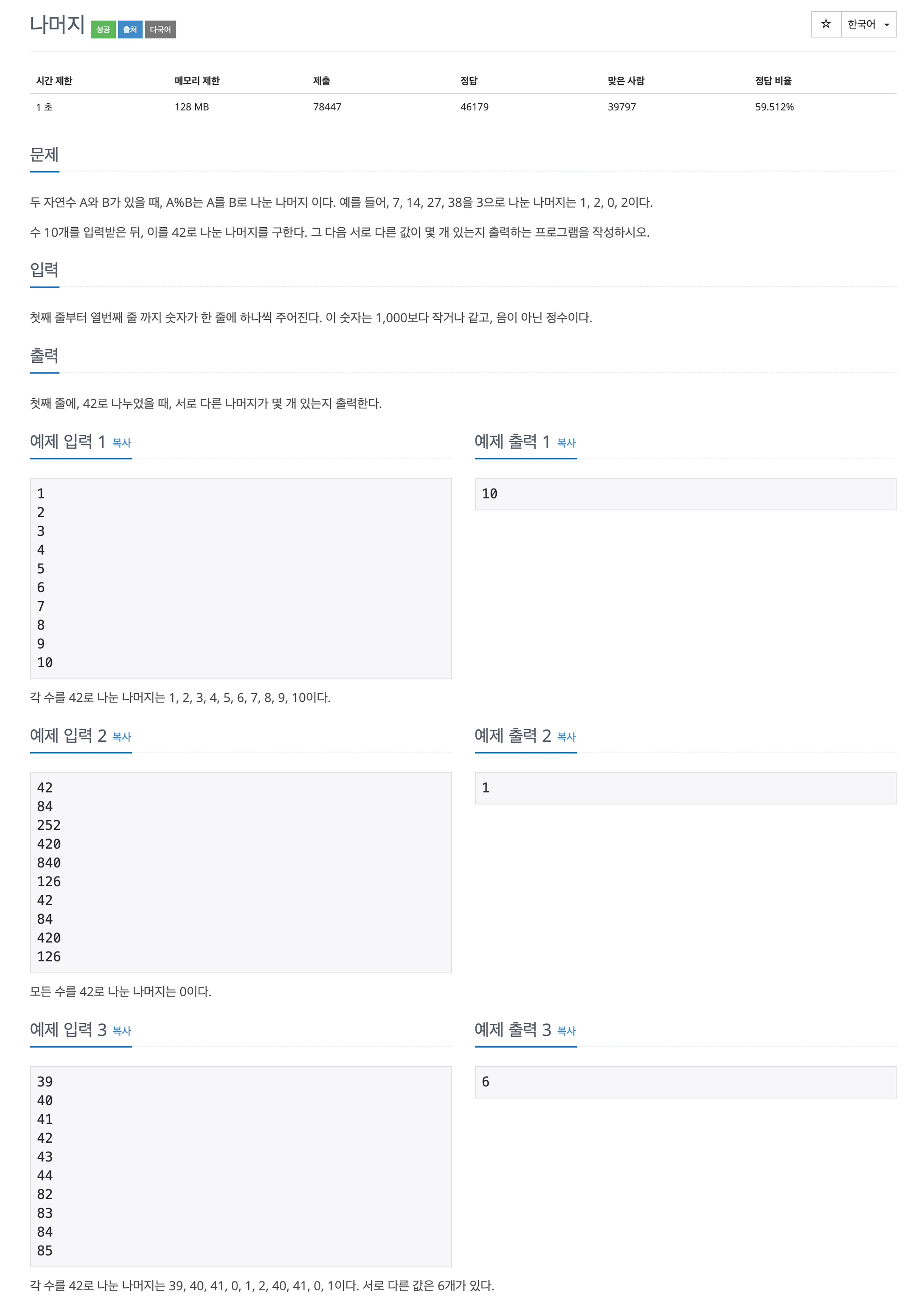 그러면 42로 나눈 나머지가 갖을 수 있는 수는 0~41 이므로 42 크기의 배열을 선언해준 뒤, 해당 배열을 활용하면 되겠다.