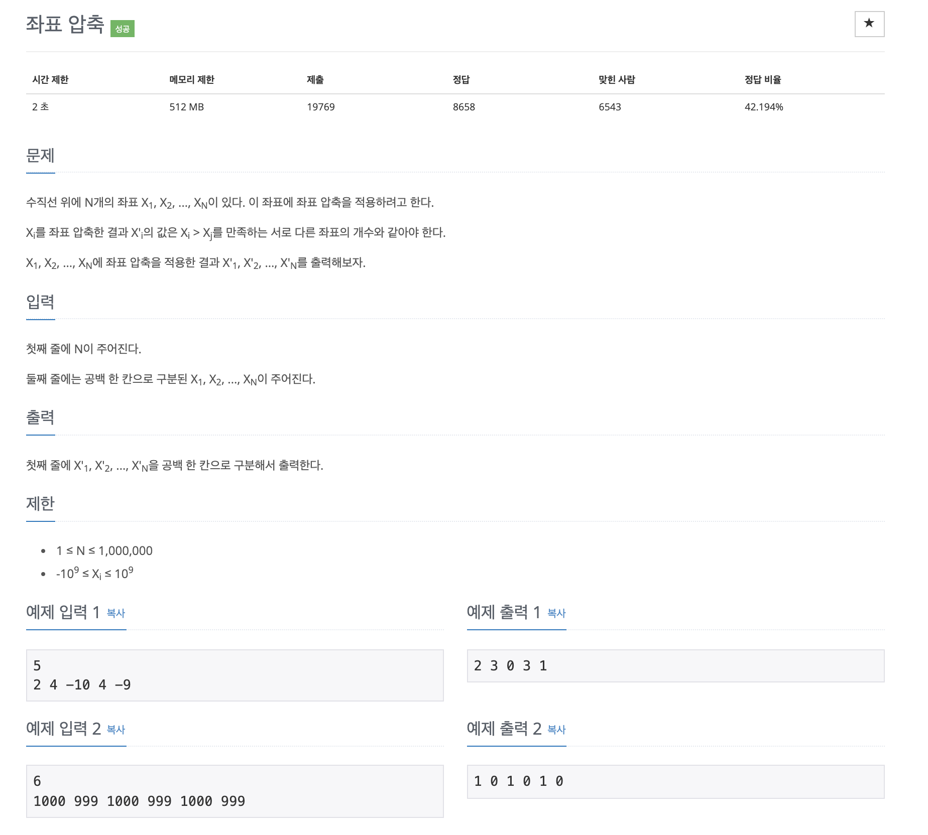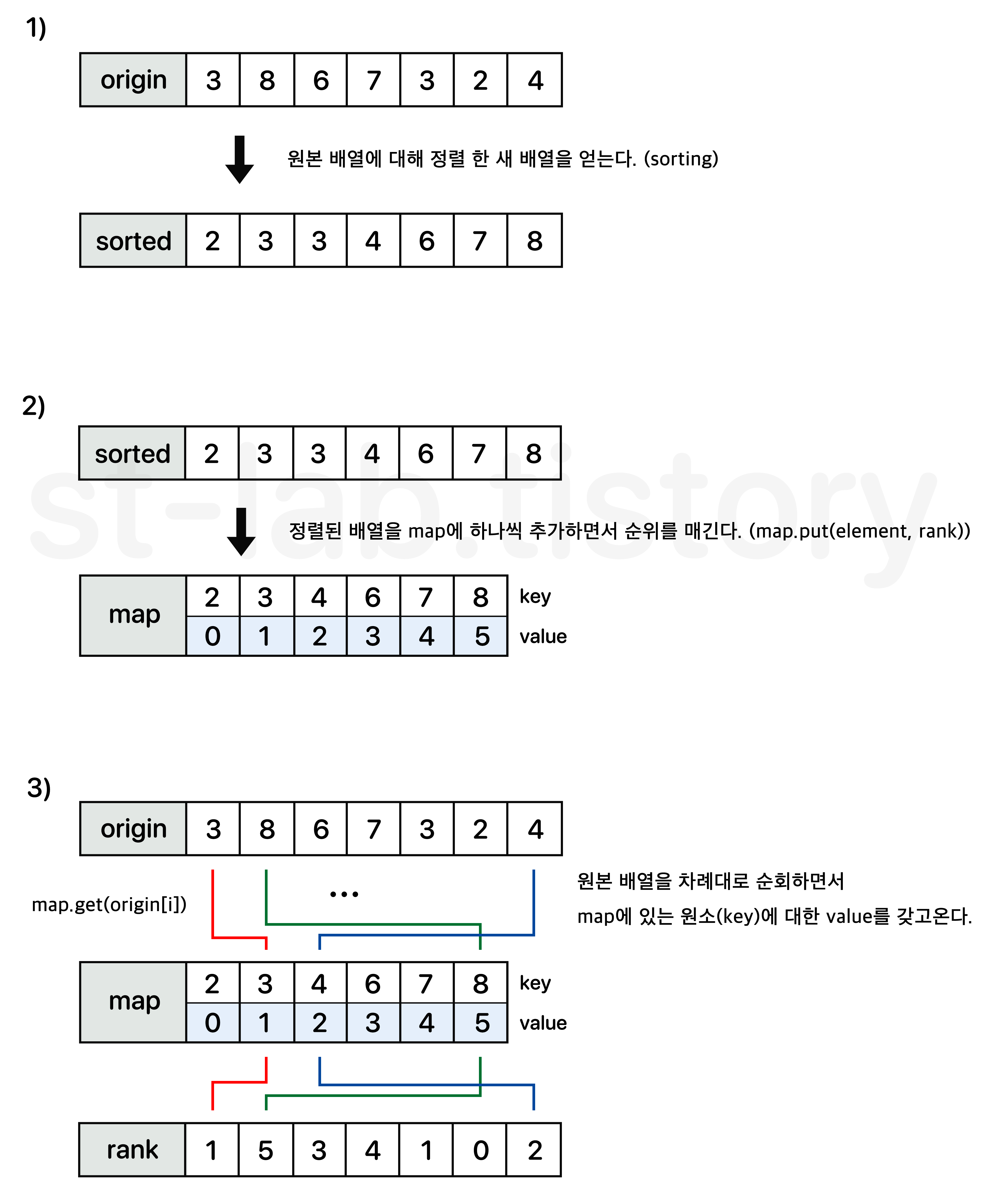 위 문제를 보니 좌표 압축이라고는 되어있긴 하지만, 정확히는 좌표 압축 알고리즘을 활용한 ranking list를 만드는 문제라고 보는 것이 좀 더 직관적이지 않나.. 생각을 한다.