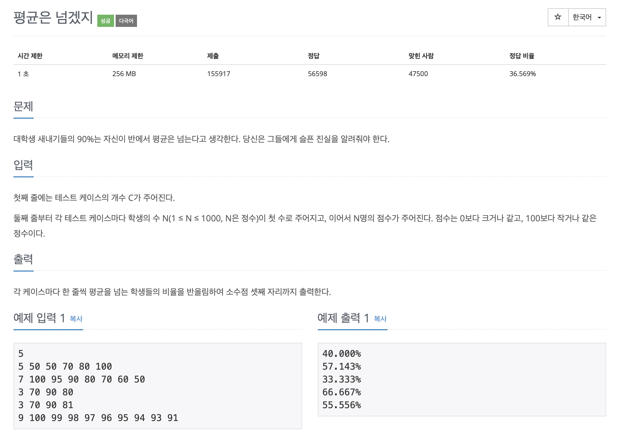 [백준] 4344번 : 평균은 넘겠지 - [C++]