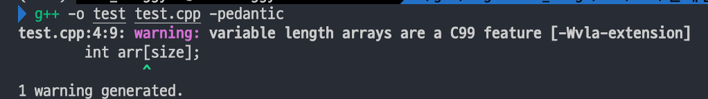 -pedantic 명령어는 비표준 구현 부분을 진단하여 경고를 보낸다. 아래와 같이 말이다.