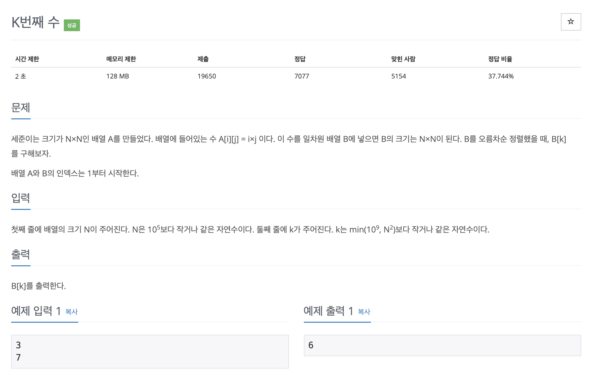 세준이는 크기가 N×N인 배열 A를 만들었다. 배열에 들어있는 수 A[i][j] = i×j 이다. 이 수를 일차원 배열 B에 넣으면 B의 크기는 N×N이 된다. B를 오름차순 정렬했을 때, B[k]를 구해보자. 배열 A와 B