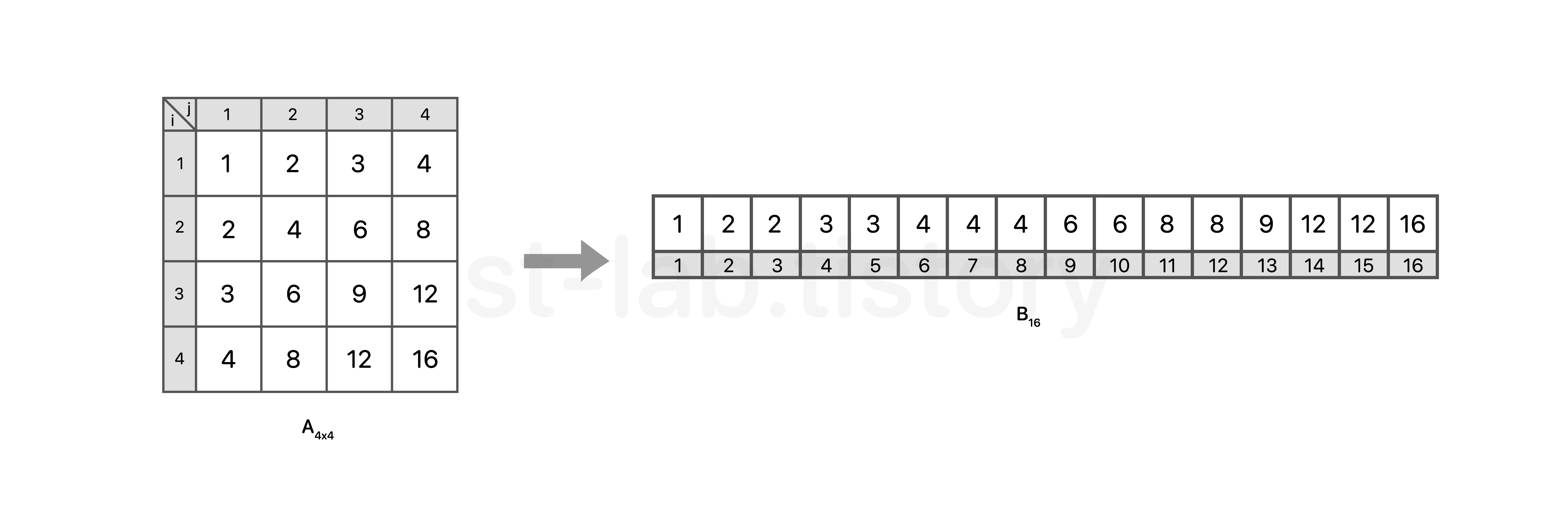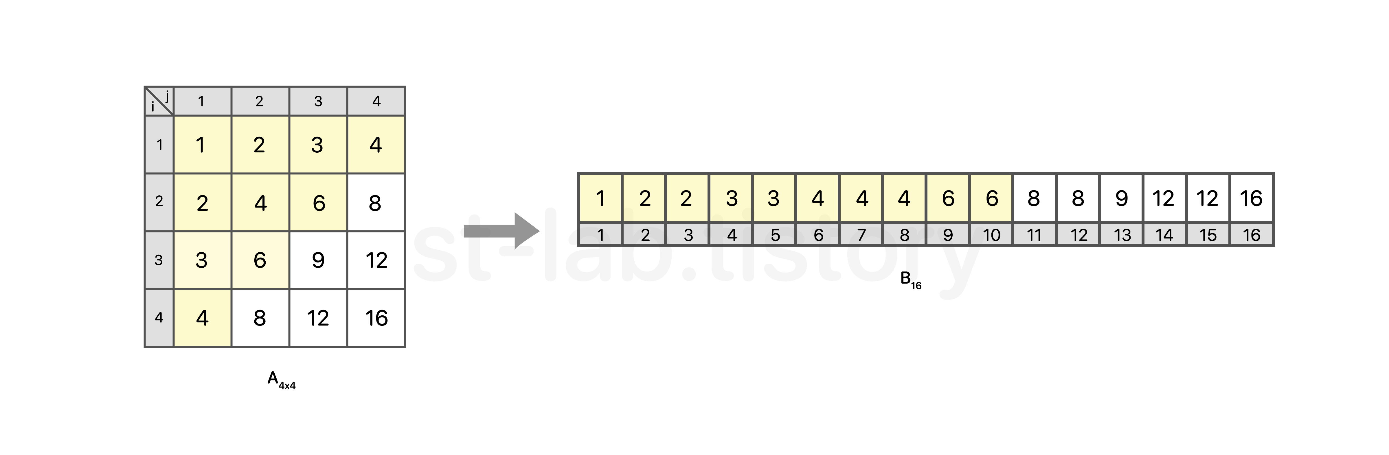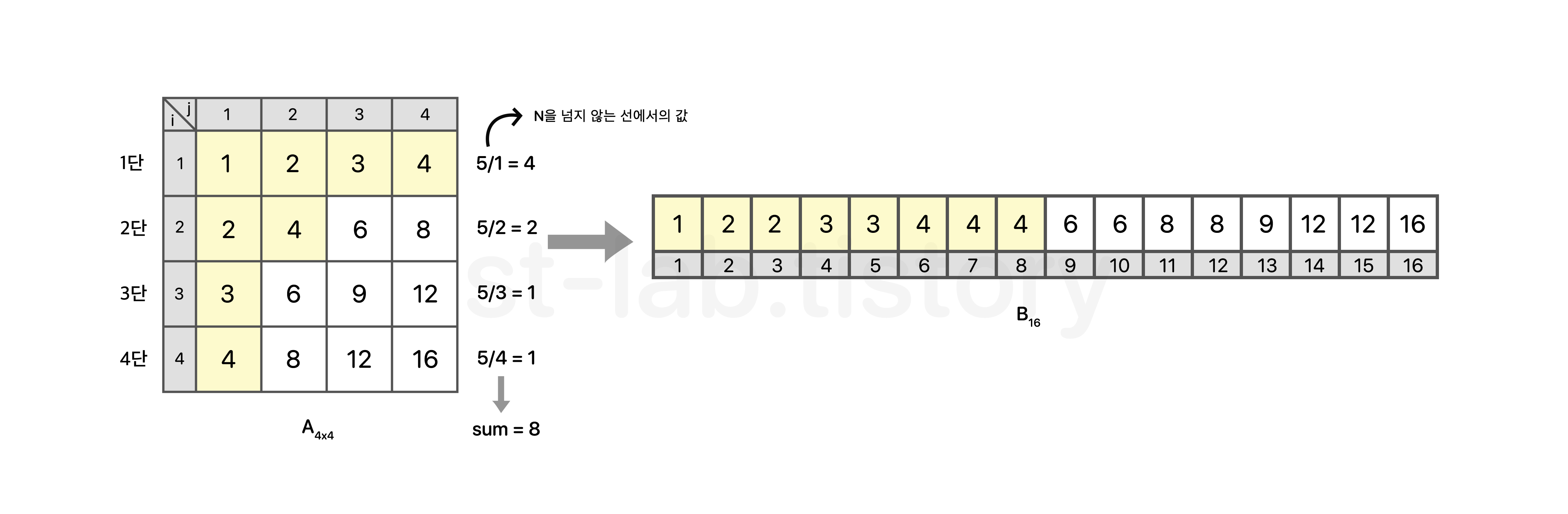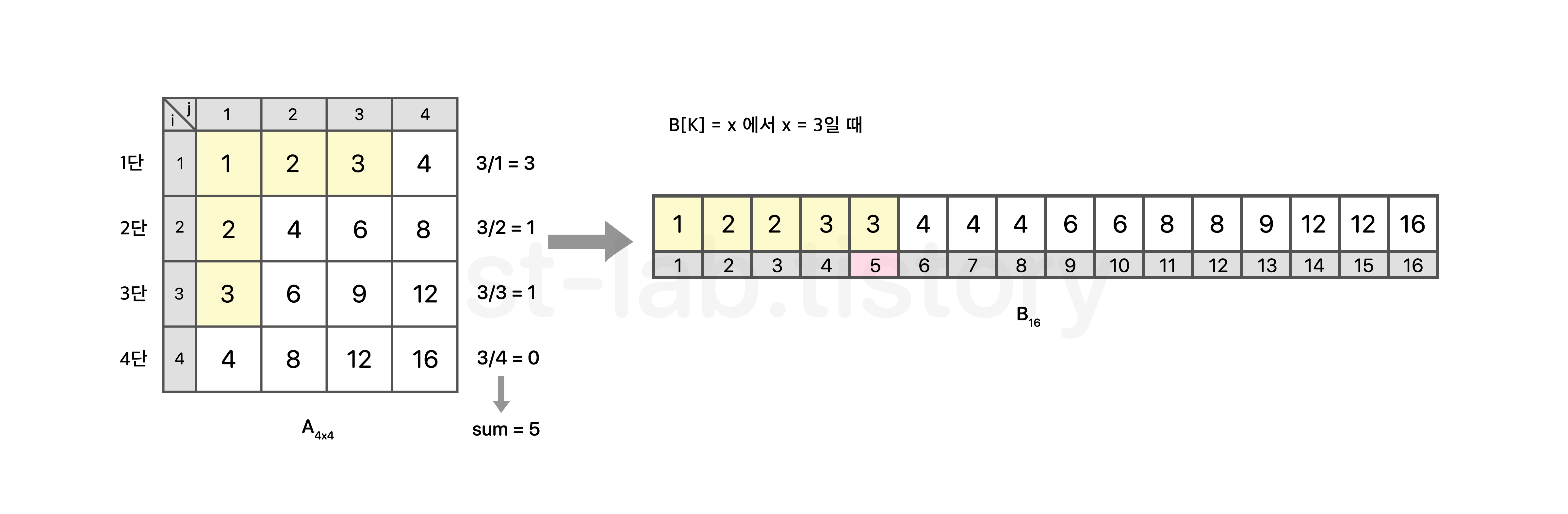 줄일 수 있다. 위를 보면, B행렬에서 𝑥 ≤ K 라는 것을 확인 할 수 있다. 당연하겠지만, K가 가질 수 있는 인덱스는 N2 안에서 한정되어 있고, K의 최댓값은 N2 이랑 같기 때문에 반드시 𝑥 ≤ K 일 수 밖에 없다. (위 예시에서 N=4일 때, K의 최댓값은 4 * 4 인 16이 될 것이다. 이는 A[4][4] = 4 * 4로 결국 B[16] = 16 으로 𝑥 는 N2 값을 벗어나지 못한다.