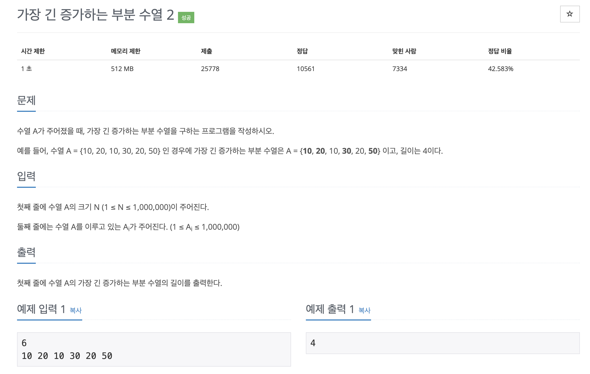 LIS, 즉 가장 긴 증가하는 부분 수열이라함은 결국 중점이 '증가' 한다는 것과 '가장 길다' 는 것이다.