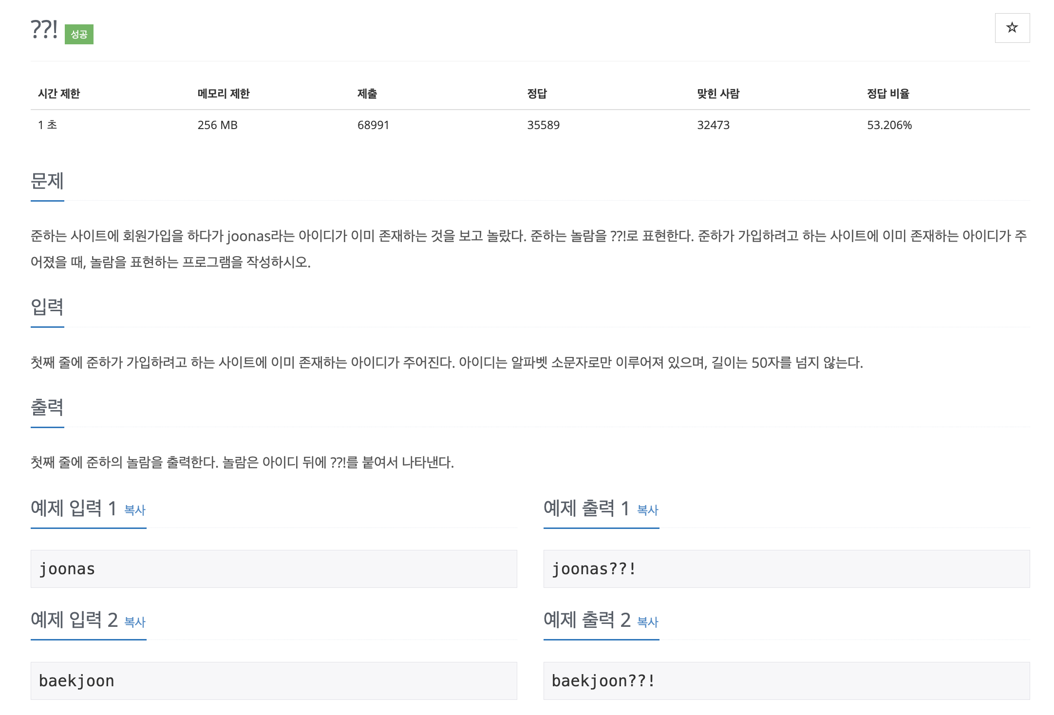 준하는 사이트에 회원가입을 하다가 joonas라는 아이디가 이미 존재하는 것을 보고 놀랐다. 준하는 놀람을 ??!로 표현한다. 준하가 가입하려고 하는 사이트에 이미 존재하는 아이디가 주어졌을 때