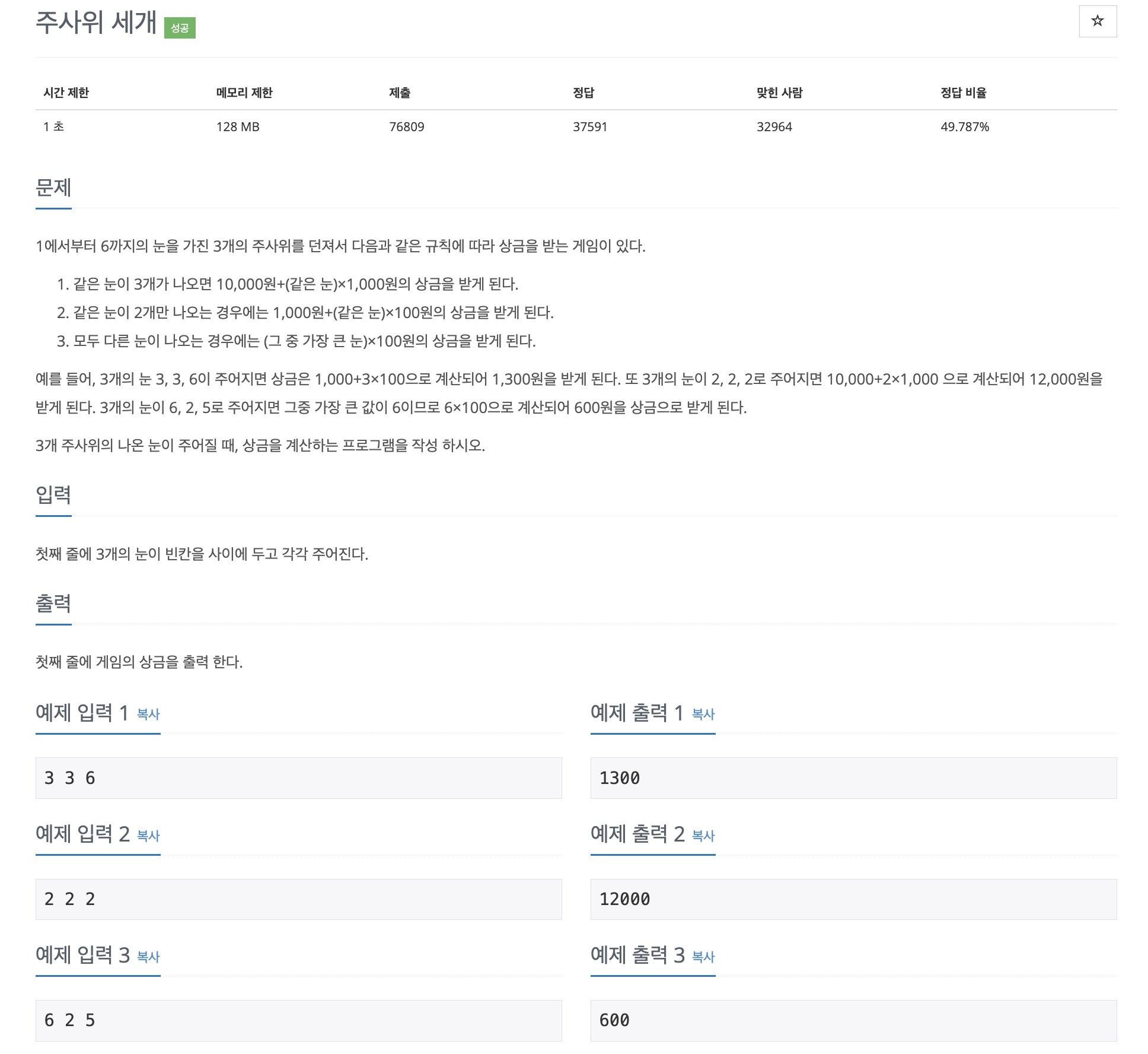 만약 모두 같다면 그대로 문제에 제시된 1번 조건처럼 10000 + 주사위 눈 * 1000 을 하면 되고, 아닐경우에는 한 묶음이 같다는 것이니, 그 같은 수를 찾으면 된다.