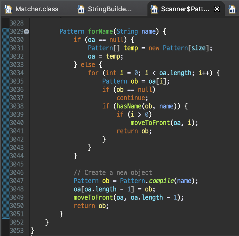 필자가 포스팅하면서 Scanner 는 속도가 느리다. 성능이 좋지 않다고 한 이유가 바로 다음과 같은 정규식을 불필요할 정도(?)로 많이 검사하기 때문이다. (물론 장점도 있다. 강력한 정규식 검사로 인해 여러 예외적인 입력 값에 대해서도 입력받은 값이 특정 타입으로 변환 할 수 있는지를 정확하게 파악할 수 있다. 즉, 타입 변환의 안정성이 매우 뛰어나다는 점이다.)