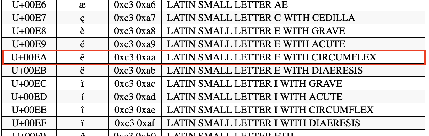 즉 어떤 문자가 128이라는 값에 대응된다면, 128은 16진수로는 x0080, 2진수로는 00000000 10000000는데, 이 때 인코딩 될 때에는 00000000 10000000 중 '파란색 부분'만 떼어서 110xxxxx 10xxxxxx에 차례대로 채워넣어주면 된다.